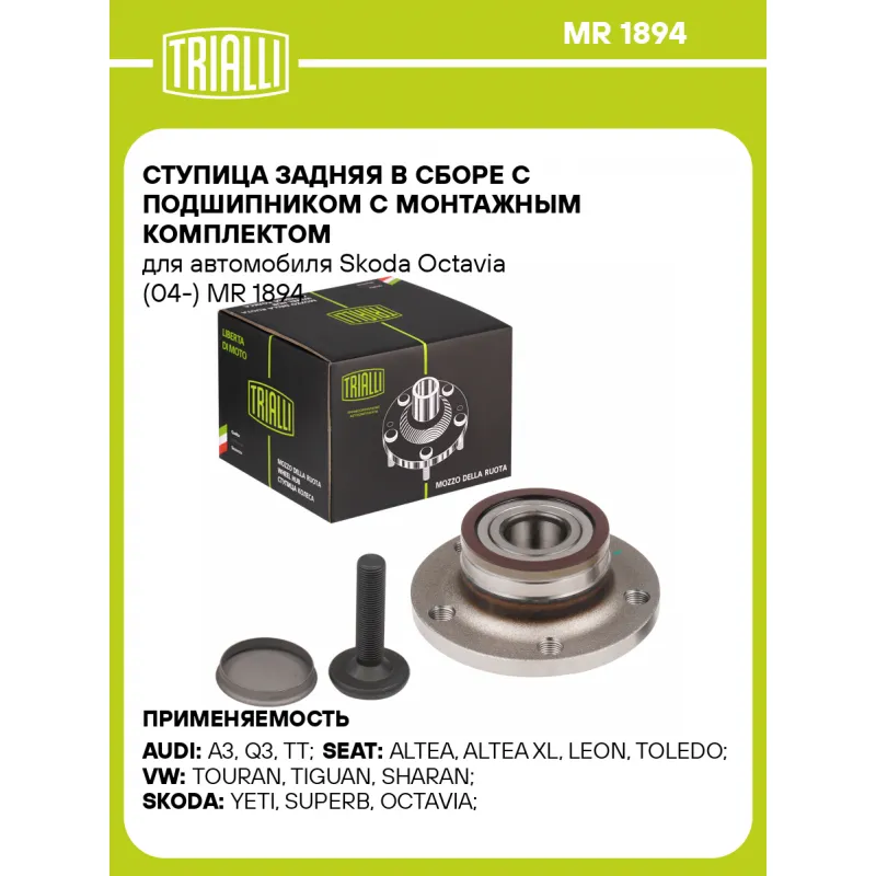 Ступица задняя в сборе с подшипником с монтажным комплектом для автомобиля Skoda Octavia (04-) Характеристики: Артикул: MR 1894 OEM номера: 1T0501611, 1T0501611A, 1T0501611H, 1T0501611M, 1T0598611, 1T0598611A, 1T0598611B, 3G0598611, 5QF598611, 7N0598611, wht007150, 1j0501249c Товарная линейка: BLACK Количество на автомобиль: 2 Подходящий болт колесный AIRLINE:: ABLT001 Сторона установки: Сзади, слева/справа Высота, мм: 67,7 Внутренний диаметр, мм: 32 Внешний диаметр, мм: 136,5 Особенности конструкции:: С подшипником Гарантийный срок: 1 год/30 000 км Крепление колёсного диска: M14x1,5 Разболтовка (PCD):: 5x112 Разболтовка (PCD): 5-M14x1.5-112 Комплектация: Болт - 1 шт Крышка - 1 шт Ступица - 1 шт Гарантия: от 1 года.