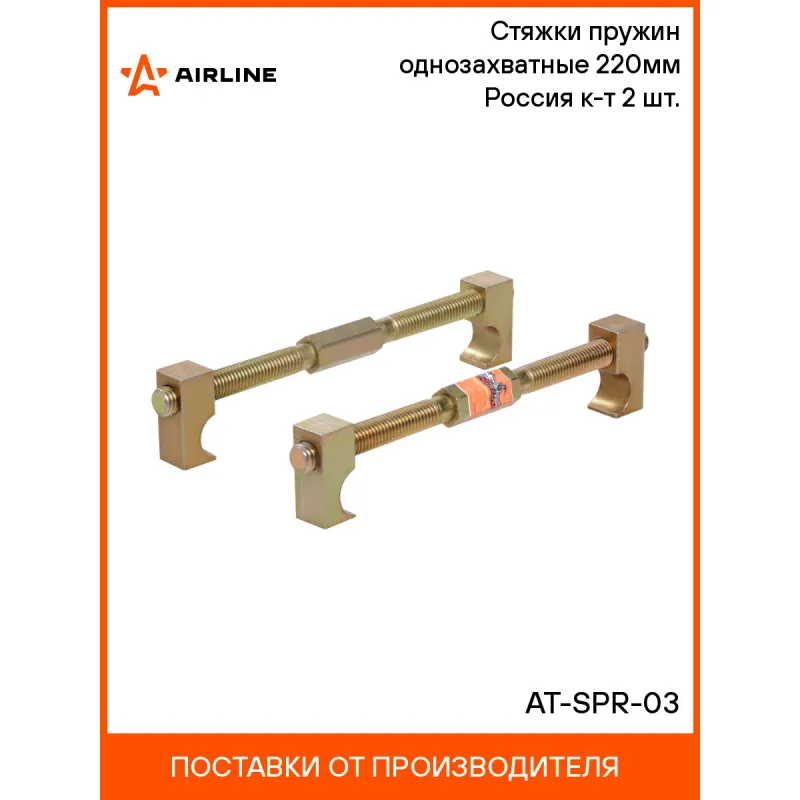 Стяжки пружин однозахватные 220мм Россия к-т 2 шт. Описание: Комплект из двух прочных стяжек для пружин подвески. Применяются для сжатия и удержания пружин подвески автомобиля во время его ремота или обслуживания Характеристики: Артикул: AT-SPR-03 Размер, мм: 220 Шестигранник, мм: 16 Резьба: М12x2 Комплектация: Стяжка пружины 220мм - 2 шт Гарантия: от 1 года.