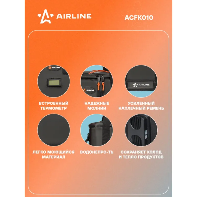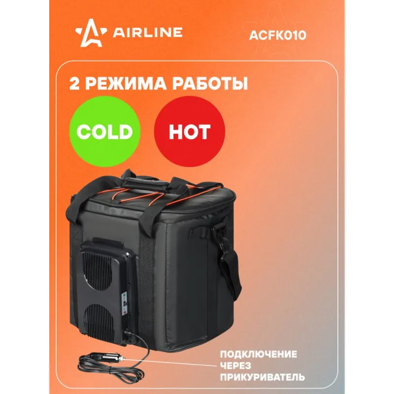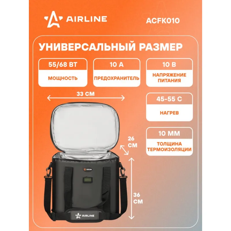 Сумка-холодильник термоэлектр. "Black Edition" 30 л, охлажд/нагрев 12В, 55/68Вт, 36*26*33см, черная Описание: Сумка холодильник термосумка "Black Edition", 36*26*33 см AIRLINE ACFK010 - это надежное средство для обеспечения необходимой температуры и поддержания ее на протяжении длительного периода времени при транспортировки продуктов в автомобиле. Сохранение температуры происходит из-за применяемых в составе изделия теплоизолирующих материалов, в который входят брезент, вспененный полиэтилен, а также водонепроницаемая PEVA пленка. Сумка имеет кубической форму, что позволяет использовать ее не только для хранения продуктов, но и для перевозки oбъемных вещей. Дополнительно сумка снабжена элементом "Пельтье" с функцией охлаждения и нагрева, работающего от автомобильной сети 12В. Полезный аксессуар, который позволит сохранить необходимую температуру (холод или тепло) в течение длительного времени - . Особенности: *Сумка объемом ; *Удобные ручки для переноски. *Полностью герметичная модель, водонепроницаемая. *Материалы: Брезент, вспененый ПE, 15C PEVA (полиэтиленвинилацетат), пластик; Эстетичный аксессуар - летняя сумка для перевозки продуктов питания и набора посуды для пикника. Это незаменимая вещь для отдыха на природе, дорожный органайзер, который можно наполнить продуктами и напитками для пикника на свежем воздухе, также подходит для перевозки лекарств. Термосумку холодильник можно использовать для контейнеров с горячим обедом или ужином, ланчем, продуктами, бутылочек с детским питанием. Термосумка AIRLINE - это главный аксессуар автомобильного, дачного, пляжного, туристического отдыха, для похода, для кемпинга, для дачи, в дорогу. Практичное приобретение для семей с детьми, взрослых мужчин и женщин, девушек и парней, которые любят отдых на природе. Термостойкий качественный контейнер - это отличный подарок для жены, мужа, папы, мамы, лучшего друга или подруги на день рождения, юбилей, 8 Марта и 23 Февраля, Новый год. Характеристики: Артикул: ACFK010 Охлаждение ниже окр. среды, С: 12 Нагрев, С: 45-55 Комплектация: Питающий шнур с разъемом в прикуриватель - 1 шт Сумка - 1 шт ПЭ пакет вкладышем - 1 шт Гарантия: от 1 года.