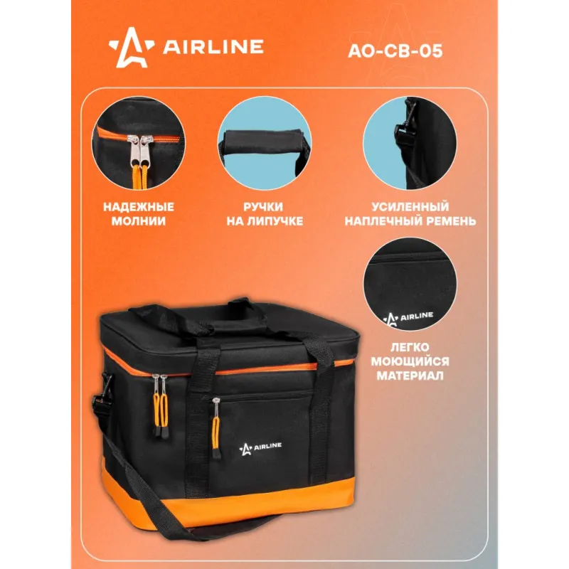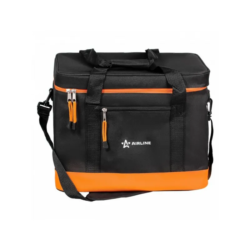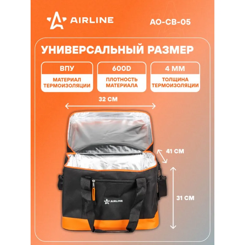 Сумка-холодильник (термосумка) 40 л, 32*41*31 см, цвет черный/оранжевый Описание: Сумка-холодильник AO-CB-05 от бренда AIRLINE из материала плотностью 600 ден (D) - полезный аксессуар, который позволит сохранить необходимую температуру (холод или тепло) в течение длительного времени - 35 ч. Особенности: *Сумка объемом 40 л; *Удобные ручки для переноски, с длинным плечевым ремнем; *Полностью герметичная модель с несколькими отделениями и карманами. *Материалы: полиэстер 600D, вспененный полиуретан, фольгированный материал; *Толщина термоизолирующей пленки - 4 мм. Эстетичный аксессуар сумка летняя для перевозки продуктов питания и набора посуды для пикника, требующих сохранения определенной температуры, незаменимая вещь для отдыха на природе, дорожный органайзер, который можно наполнить продуктами и напитками для пикника на свежем воздухе, перевозки лекарств. Термосумку холодильник можно использовать для контейнеров с горячим обедом или ужином, ланчем, для хранения пищевых продуктов, бутылочек с детским питанием, можно использовать в качестве минихолодильника, если наполнить его хладоэлементами (аккумуляторами холода). Термосумка AIRLINE - это главный аксессуар автомобильного, дачного, пляжного, туристического отдыха, для похода, для кемпинга, для дачи, в дорогу. Стильная сумочка на замке - молнии станет практичным приобретением для семей с детьми, взрослых мужчин и женщин, девушек и парней, которые любят отдых на природе. Термостойкий качественный контейнер - это отличный подарок для жены, мужа, папы, мамы, лучшего друга или подруги на день рождения, юбилей, 8 Марта и 23 Февраля, Новый год. Характеристики: Артикул: AO-CB-05 Объем, л: 40 Длина, мм: 320 Ширина, мм: 410 Высота, мм: 310 Толщина термоизоляции, мм: 4 Материал термоизоляции: ВПУ Температура использования, С: -40/+60 Плотность материала, ден (D): 600 Водонепроницаемость: частичная Грузоподъемность, кг: 20 Время сохранения температуры, ч: 35 Комплектация: Сумка - 1 шт ПЭ пакет с вкладышем - 1 шт Гарантия: от 1 года.