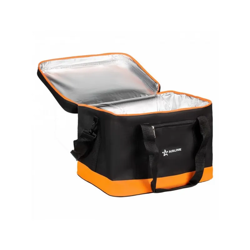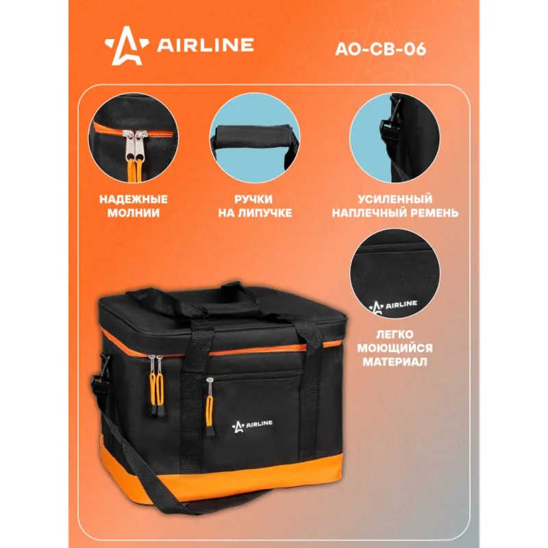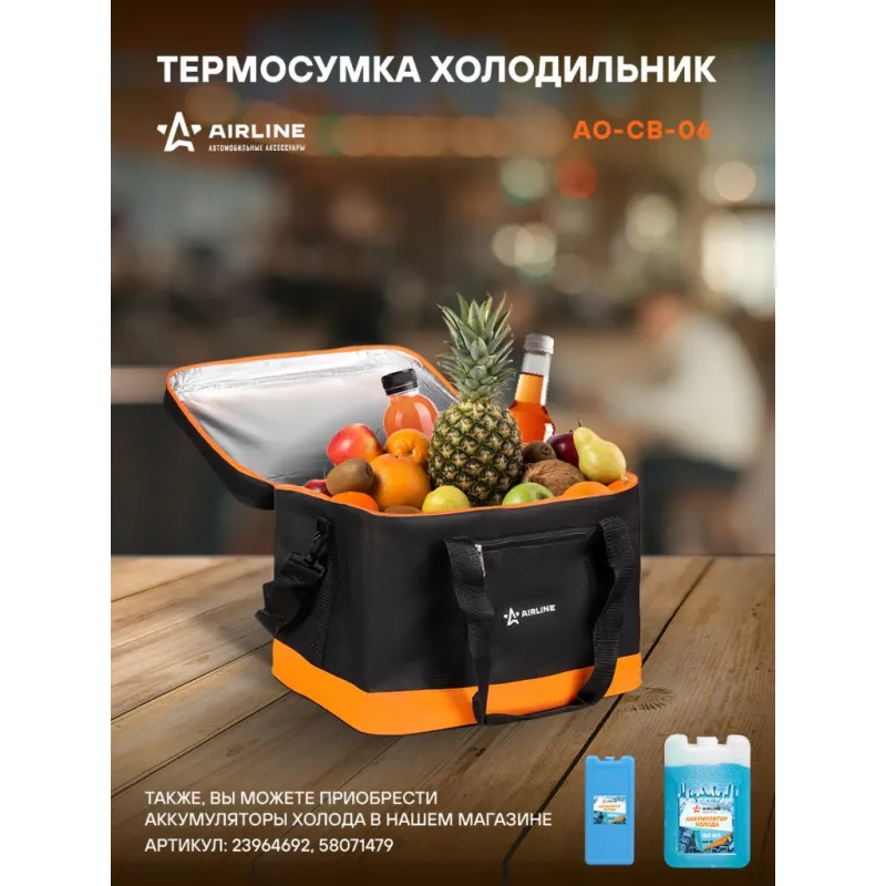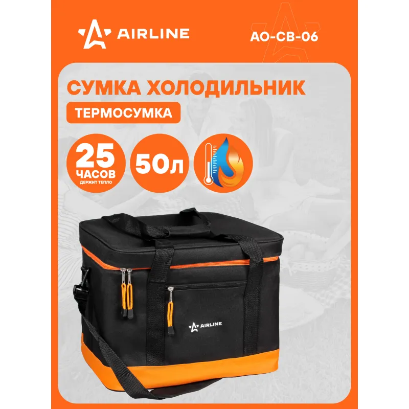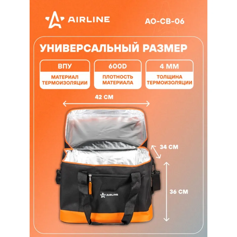 Сумка-холодильник (термосумка) 50 л, 34*42*36 см, цвет черный/оранжевый Описание: Сумка-холодильник AO-CB-06 от бренда AIRLINE из материала плотностью 600 ден (D) - полезный аксессуар, который позволит сохранить необходимую температуру (холод или тепло) в течение длительного времени - 25 ч. Особенности: *Сумка объемом 50 л; *Удобные ручки для переноски, с длинным плечевым ремнем; *Полностью герметичная модель с несколькими отделениями и карманами. *Материалы: полиэстер 600D, вспененный полиуретан, фольгированный материал; *Толщина термоизолирующей пленки - 4 мм. Эстетичный аксессуар сумка летняя для перевозки продуктов питания и набора посуды для пикника, требующих сохранения определенной температуры, незаменимая вещь для отдыха на природе, дорожный органайзер, который можно наполнить продуктами и напитками для пикника на свежем воздухе, перевозки лекарств. Термосумку холодильник можно использовать для контейнеров с горячим обедом или ужином, ланчем, для хранения пищевых продуктов, бутылочек с детским питанием, можно использовать в качестве минихолодильника, если наполнить его хладоэлементами (аккумуляторами холода). Термосумка AIRLINE - это главный аксессуар автомобильного, дачного, пляжного, туристического отдыха, для похода, для кемпинга, для дачи, в дорогу. Стильная сумочка на замке - молнии станет практичным приобретением для семей с детьми, взрослых мужчин и женщин, девушек и парней, которые любят отдых на природе. Термостойкий качественный контейнер - это отличный подарок для жены, мужа, папы, мамы, лучшего друга или подруги на день рождения, юбилей, 8 Марта и 23 Февраля, Новый год. Характеристики: Артикул: AO-CB-06 Объем, л: 50 Длина, мм: 420 Ширина, мм: 340 Высота, мм: 360 Толщина термоизоляции, мм: 4 Материал термоизоляции: ВПУ Температура использования, С: -40/+60 Плотность материала, ден (D): 600 Водонепроницаемость: частичная Грузоподъемность, кг: 20 Время сохранения температуры, ч: 25 Комплектация: Сумка - 1 шт ПЭ пакт с вкладышем - 1 шт Гарантия: от 1 года.