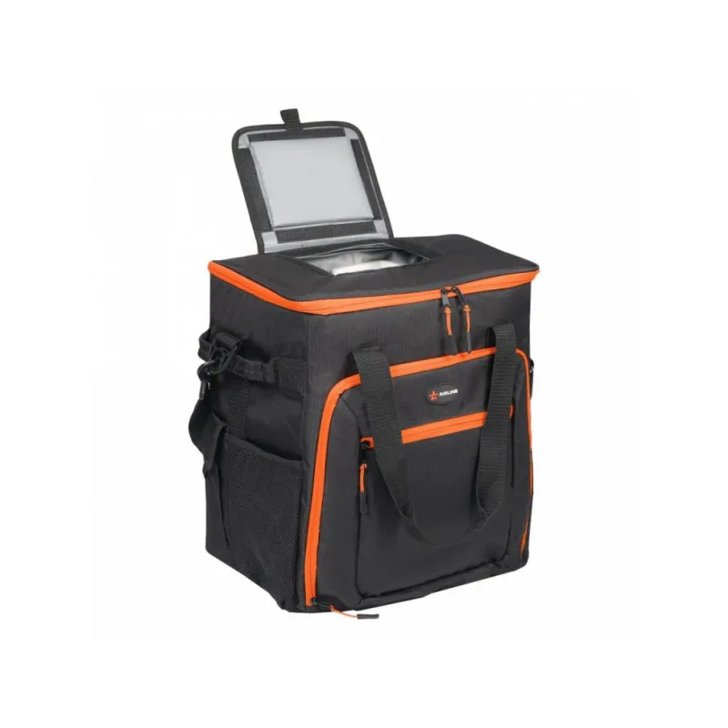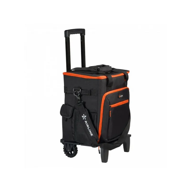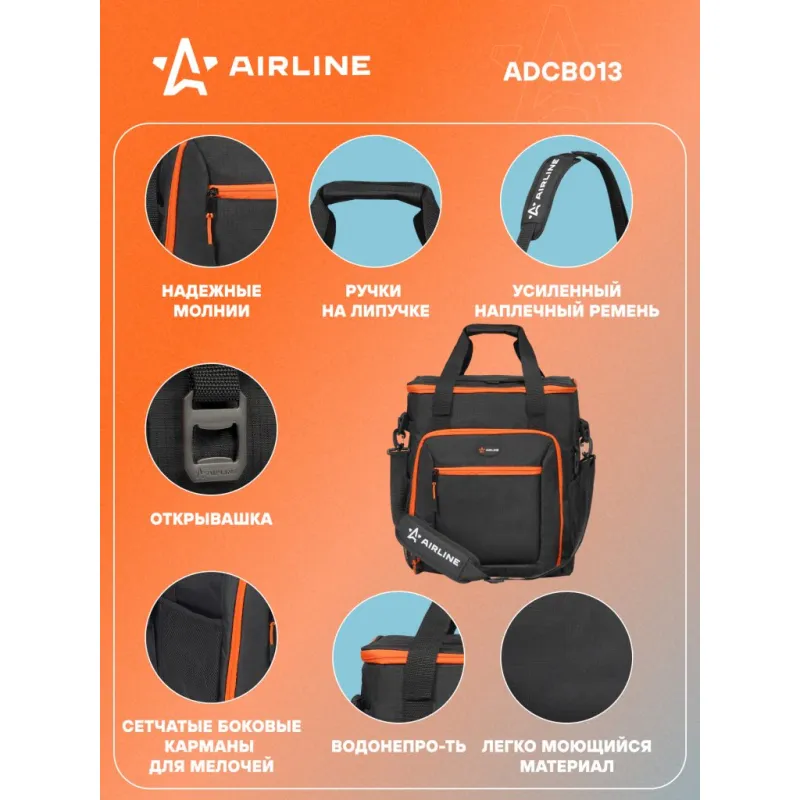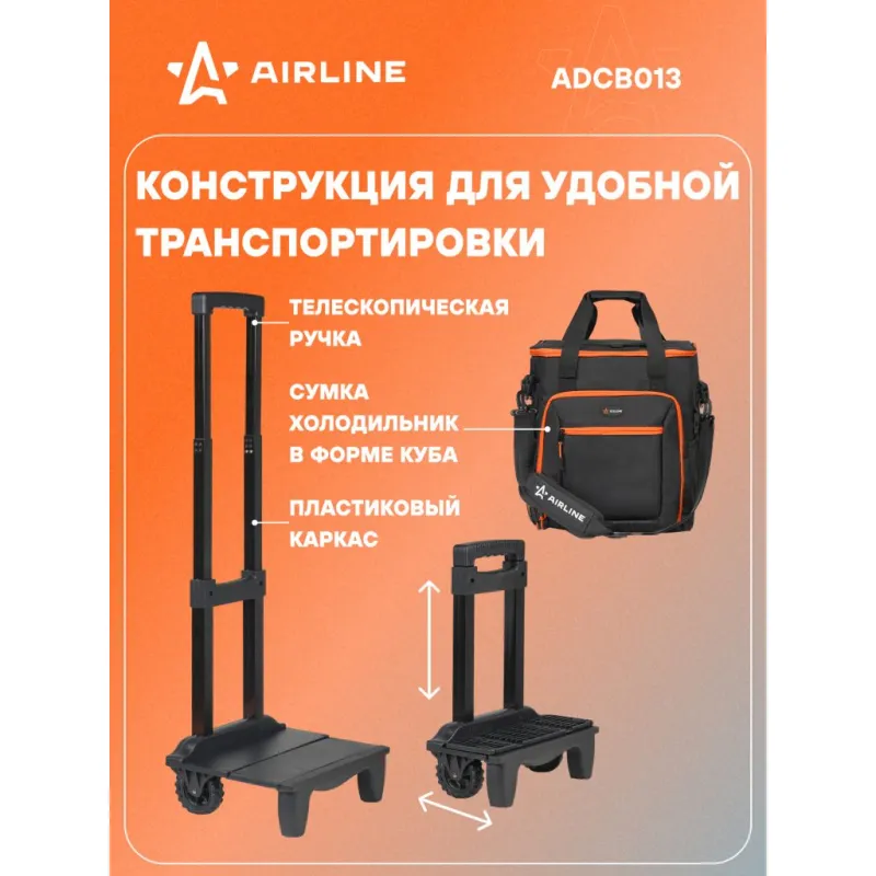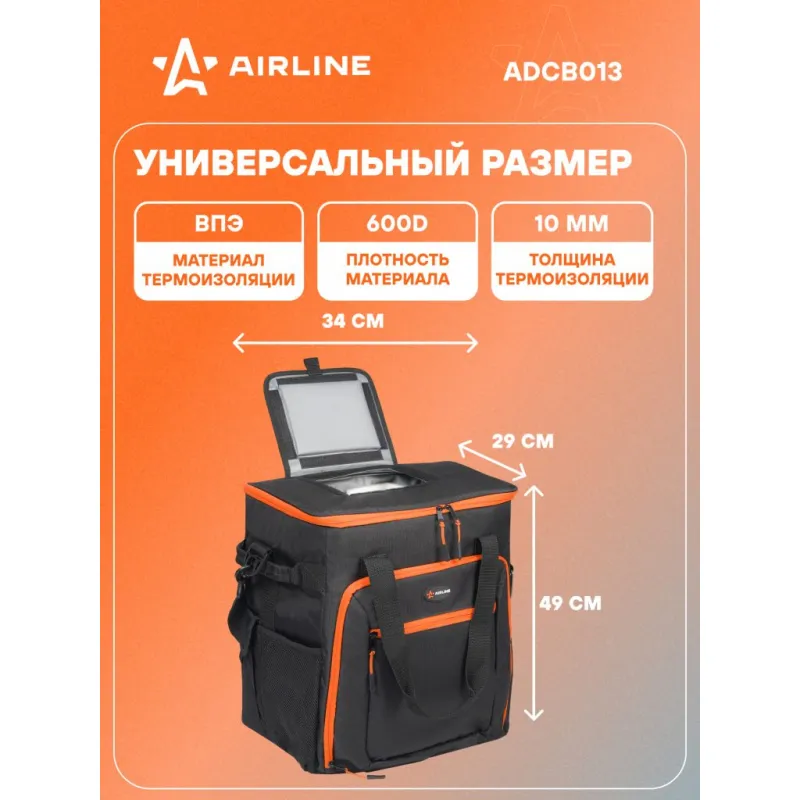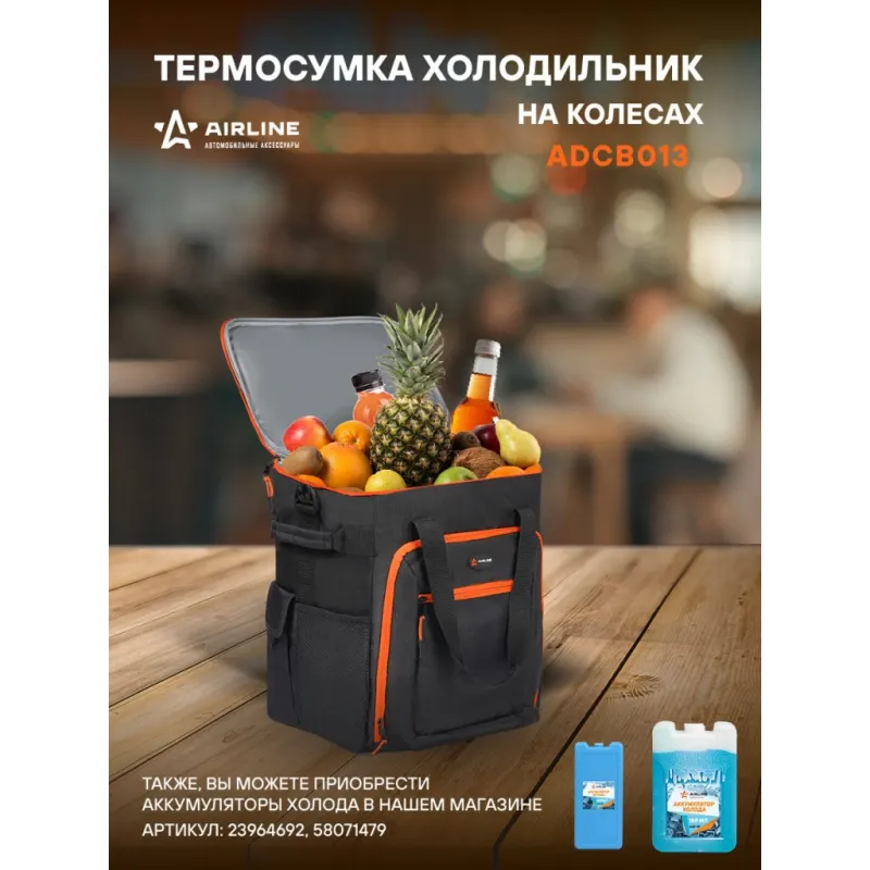 Сумка-холодильник (термосумка) на колесах с телескоп.ручкой 48 л, водонепр., черн./оранж. Описание: Сумка-холодильник на колесиках с телескопической ручкой ADCB013 от бренда AIRLINE из водонепроницаемого материала 600 ден (D) - полезный аксессуар, который позволит сохранить необходимую температуру (холод или тепло) в течение длительного времени - 35 ч. Особенности: *Сумка объемом 48 л; *Открывашка для бутылок; *Водонепроницаемый материал; *Сумка размещена на пластиковом каркасе с колесиками и складной телескопической ручкой для легкой и удобной транспортировки; *Полностью герметичная модель с несколькими отделениями и карманами. *Материалы: Полиэстер 600D/ПВХ, вспененный ПЭ,25 CP EVA, пластик; *Толщина термоизолирующей пленки - 10 мм. Эстетичный аксессуар сумка летняя для перевозки продуктов питания и набора посуды для пикника, требующих сохранения определенной температуры, незаменимая вещь для отдыха на природе, дорожный органайзер, который можно наполнить продуктами и напитками для пикника на свежем воздухе, перевозки лекарств. Термочемодан - холодильник можно использовать для контейнеров с горячим обедом или ужином, ланчем, для хранения пищевых продуктов, бутылочек с детским питанием, можно использовать в качестве минихолодильника, если наполнить его хладоэлементами (аккумуляторами холода). Термосумка AIRLINE - это главный аксессуар автомобильного, дачного, пляжного, туристического отдыха, для похода, для кемпинга, для дачи, в дорогу. Стильная сумочка на замке - молнии станет практичным приобретением для семей с детьми, взрослых мужчин и женщин, девушек и парней, которые любят отдых на природе. Термостойкий качественный контейнер - это отличный подарок для жены, мужа, папы, мамы, лучшего друга или подруги на день рождения, юбилей, 8 Марта и 23 Февраля, Новый год. Характеристики: Артикул: ADCB013 Объем, л: 48 Длина, мм: 340 Ширина, мм: 290 Высота, мм: 490 Толщина термоизоляции, мм: 10 Материал термоизоляции: ВПЭ Температура использования, С: -40/+60 Плотность материала, ден (D): 600 Водонепроницаемость: да Грузоподъемность, кг: 30 Время сохранения температуры, ч: 35 Комплектация: Cумка с колесами и ручкой - 1 шт ПЭ пакет с вкладышем - 1 шт Гарантия: от 1 года.