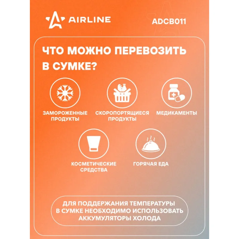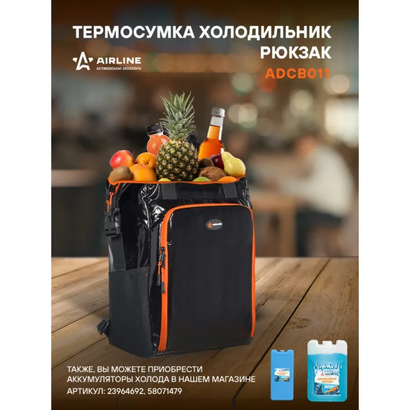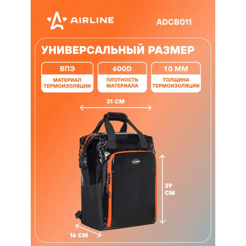 Сумка-холодильник (термосумка) рюкзак 19 л, 39*31*16см, Ripstop, водонепр.,черн. Описание: Сумка-холодильник ADCB011 от бренда AIRLINE, термо рюкзак, из водонепроницаемого материала 600 ден (D) - полезный аксессуар, который позволит сохранить необходимую температуру (холод или тепло) в течение длительного времени - 35 ч. Особенности: *Сумка объемом 19 л; *Открывашка для бутылок; *Водонепроницаемый материал; *Удобные наплечные лямки и усиленные верхние ручки; *Полностью герметичная модель с несколькими отделениями и карманами. *Материалы: Полиэстер 210D«Рип-стоп» с покрытием -Термопластичный полиуретан, вспененный ПЭ, 25C PEVA,пластик; *Толщина термоизолирующей пленки - 10 мм. Эстетичный аксессуар сумка летняя для перевозки продуктов питания и набора посуды для пикника, требующих сохранения определенной температуры, незаменимая вещь для отдыха на природе, дорожный органайзер, который можно наполнить продуктами и напитками для пикника на свежем воздухе, перевозки лекарств. Термосумку холодильник можно использовать для контейнеров с горячим обедом или ужином, ланчем, для хранения пищевых продуктов, бутылочек с детским питанием, можно использовать в качестве минихолодильника, если наполнить его хладоэлементами (аккумуляторами холода). Термосумка AIRLINE - это главный аксессуар автомобильного, дачного, пляжного, туристического отдыха, для похода, для кемпинга, для дачи, в дорогу. Стильная сумочка на замке - молнии станет практичным приобретением для семей с детьми, взрослых мужчин и женщин, девушек и парней, которые любят отдых на природе. Термостойкий качественный контейнер - это отличный подарок для жены, мужа, папы, мамы, лучшего друга или подруги на день рождения, юбилей, 8 Марта и 23 Февраля, Новый год. Характеристики: Артикул: ADCB011 Объем, л: 19 Длина, мм: 390 Ширина, мм: 310 Высота, мм: 160 Толщина термоизоляции, мм: 10 Материал термоизоляции: ВПЭ Температура использования, С: -40/+60 Плотность материала, ден (D): 210 Рип-стоп Водонепроницаемость: да Грузоподъемность, кг: 20 Время сохранения температуры, ч: 35 Комплектация: Сумка - 1 шт ПЭ пакет с вкладышем - 1 шт Гарантия: от 1 года.