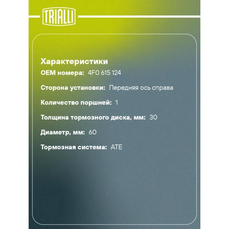 Суппорт тормозной для автомобилей Audi A4 (04-)/A6 C6 (04-) передний правый d=60мм Характеристики: Артикул: CF 052266 OEM номера: 4F0 615 124 Гарантийный срок: 2 года / 60 000 км Сопутствующий товар: Ремкомплект суппорта: RCF 052265 Сопутствующий товар: Поршень суппорта: RCF 052266 Сопутствующий товар: Скоба суппорта: CF 052320 Сопутствующий товар: Суппорт тормозной: CF 052265 Парный товар: CF 052265 Количество на автомобиль: 1 Диаметр, мм: 60 Количество поршней: 1 Толщина тормозного диска, мм: 30 Тормозная система: ATE Сторона установки: Передняя ось справа Товарная линейка: BLACK Комплектация: Скоба дискового тормозного механизма (суппорт тормозной без направляющей колодок) - 1 шт Гарантия: от 1 года.