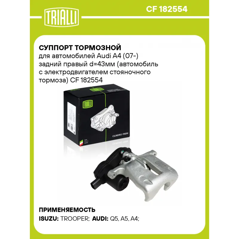 Суппорт тормозной для автомобилей Audi A4 (07-) задний правый d=43мм (автомобиль с электродвигателем стояночного тормоза) Характеристики: Артикул: CF 182554 OEM номера: 8K0615404B Сопутствующий товар: Ремкомплект суппорта: RCF 302003 Сопутствующий товар: Поршень суппорта: RCF 302004 Сопутствующий товар: Электродвигатель суппорта: RCF 182653 Сопутствующий товар: Суппорт тормозной: CF 182553 Парный товар: CF 182553 Количество на автомобиль: 1 Диаметр, мм: 43 Особенности конструкции:: Для автомобилей с электрическим стояночным тормозом Количество поршней: 1 Гарантийный срок: 2 года / 60 000 км Толщина тормозного диска, мм: 12 Тормозная система: TRW Сторона установки: Задняя ось справа Товарная линейка: BLACK Комплектация: Скоба дискового тормозного механизма (суппорт тормозной без направляющей колодок) - 1 шт Гарантия: от 1 года.