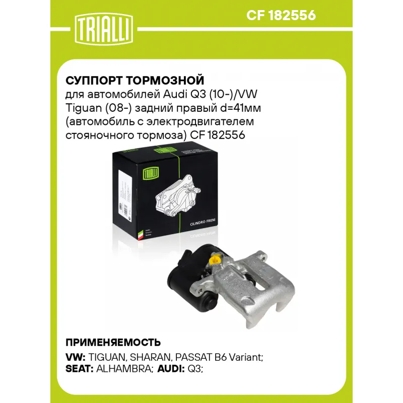 Суппорт тормозной для автомобилей Audi Q3 (10-)/VW Tiguan (08-) задний правый d=41мм (автомобиль с электродвигателем стояночного тормоза) Характеристики: Артикул: CF 182556 OEM номера: 5N0615404 Особенности конструкции:: Для автомобилей с электрическим стояночным тормозом Сопутствующий товар: Ремкомплект суппорта: RCF 302005 Сопутствующий товар: Поршень суппорта: RCF 302006 Сопутствующий товар: Электродвигатель суппорта: RCF 182655 Сопутствующий товар: Суппорт тормозной: CF 182555 Парный товар: CF 182555 Количество на автомобиль: 1 Диаметр, мм: 41 Количество поршней: 1 Гарантийный срок: 2 года / 60 000 км Толщина тормозного диска, мм: 12 Тормозная система: TRW Сторона установки: Задняя ось справа Товарная линейка: BLACK Комплектация: Скоба дискового тормозного механизма (суппорт тормозной без направляющей колодок) - 1 шт Гарантия: от 1 года.