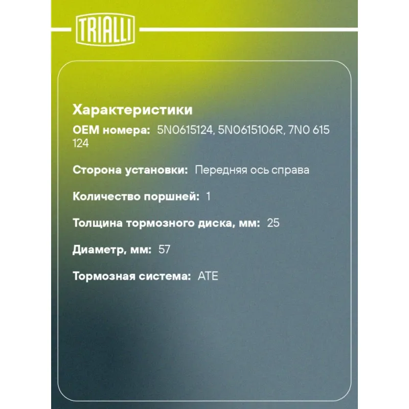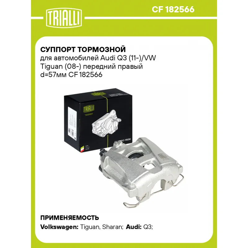 Суппорт тормозной для автомобилей Audi Q3 (11-)/VW Tiguan (08-) передний правый d=57мм Характеристики: Артикул: CF 182566 OEM номера: 5N0615124, 5N0615106R, 7N0 615 124 Сопутствующий товар: Ремкомплект суппорта: RCF 182565 Сопутствующий товар: Поршень суппорта: RCF 182566 Сопутствующий товар: Суппорт тормозной: CF 182565 Парный товар: CF 182565 Количество на автомобиль: 1 Диаметр, мм: 57 Количество поршней: 1 Гарантийный срок: 2 года / 60 000 км Толщина тормозного диска, мм: 25 Тормозная система: ATE Сторона установки: Передняя ось справа Товарная линейка: BLACK Подходит для авто: Volkswagen Tiguan (08-), Sharan (10-) Audi Q3 (11-), Q3 (11-) Для проверки применяемости отправьте VIN автомобиля через вкладку "Есть вопросы о товаре?" Комплектация: Скоба дискового тормозного механизма (суппорт тормозной без направляющей колодок) - 1 шт Гарантия: от 1 года.