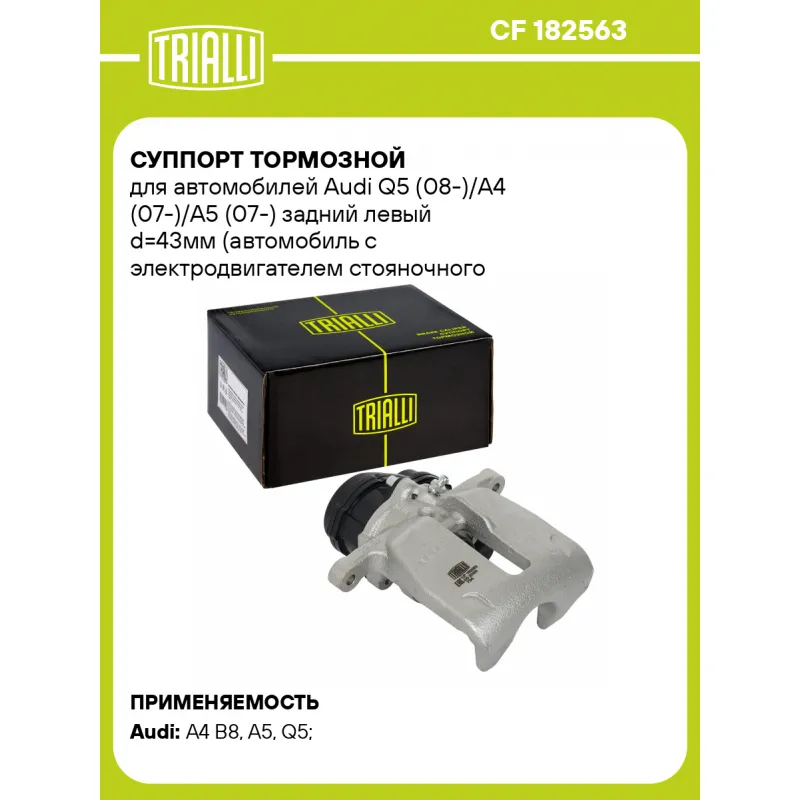 Суппорт тормозной для автомобилей Audi Q5 (08-)/A4 (07-)/A5 (07-) задний левый d=43мм (автомобиль с электродвигателем стояночного тормоза) (диск 22мм) Характеристики: Артикул: CF 182563 OEM номера: 8K0615403C, 8K0615403D Сопутствующий товар: Ремкомплект суппорта: RCF 182563 Сопутствующий товар: Поршень суппорта: RCF 182564 Сопутствующий товар: Скоба суппорта: CF 012064 Сопутствующий товар: Электродвигатель суппорта: RCM 182563 Сопутствующий товар: Суппорт тормозной: CF 182564 Парный товар: CF 182564 Количество на автомобиль: 1 Диаметр, мм: 43 Особенности конструкции:: Для автомобилей с электрическим стояночным тормозом Количество поршней: 1 Гарантийный срок: 2 года / 60 000 км Толщина тормозного диска, мм: 22 Тормозная система: TRW Сторона установки: Задняя ось слева Товарная линейка: BLACK Подходит для авто: Audi A4 B8 (07-), A4 B8 (07-), A5 (07-), A5 (07-), A5 (07-), Q5 (08-), Q5 (08-) Для проверки применяемости отправьте VIN автомобиля через вкладку "Есть вопросы о товаре?" Комплектация: Скоба дискового тормозного механизма (суппорт тормозной без направляющей колодок) - 1 шт Гарантия: от 1 года.