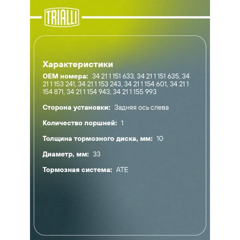 Суппорт тормозной для автомобилей BMW 3 E30 (82-) задний левый d=33мм Характеристики: Артикул: CF 208101 OEM номера: 34 21 1 151 633, 34 21 1 151 635, 34 21 1 153 241, 34 21 1 153 243, 34 21 1 154 601, 34 21 1 154 871, 34 21 1 154 943, 34 21 1 155 993, 34 21 1 160 397 Тормозная система: ATE Диаметр, мм: 33 Гарантийный срок: 2 года / 60 000 км Количество поршней: 1 Толщина тормозного диска, мм: 10 Сторона установки: Задняя ось слева Парный товар: CF 208102 Количество на автомобиль: 1 Товарная линейка: BLACK Комплектация: Скоба дискового тормозного механизма (суппорт тормозной без направляющей колодок) - 1 шт Гарантия: от 1 года.