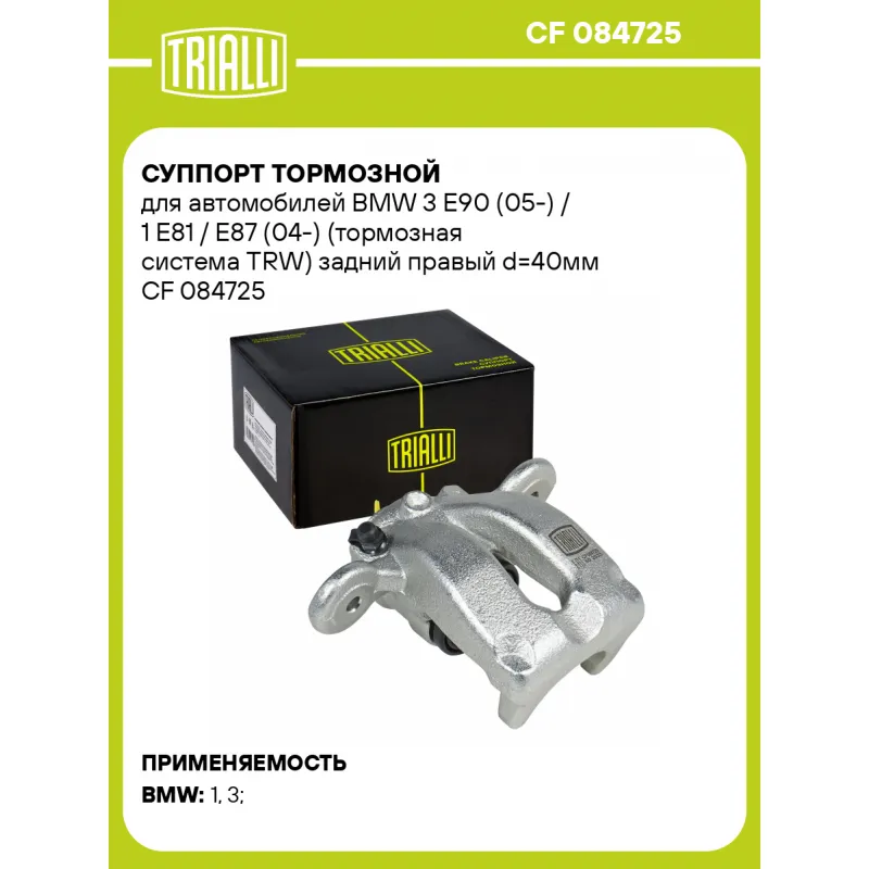 Суппорт тормозной для автомобилей BMW 3 E90 (05-) / 1 E81 / E87 (04-) (тормозная система TRW) задний правый d=40мм Характеристики: Артикул: CF 084725 OEM номера: 34 21 6 768 192, 34 21 6 776 378 Гарантийный срок: 2 года / 60 000 км Сопутствующий товар: Ремкомплект суппорта: RCF 084724 Сопутствующий товар: Поршень суппорта: RCF 084724P Сопутствующий товар: Скоба суппорта: CF 084728 Сопутствующий товар: Суппорт тормозной: CF 084724 Парный товар: CF 084724 Количество на автомобиль: 1 Диаметр, мм: 40 Количество поршней: 1 Толщина тормозного диска, мм: 10 Тормозная система: TRW Сторона установки: Задняя ось справа Товарная линейка: BLACK Комплектация: Скоба дискового тормозного механизма (суппорт тормозной без направляющей колодок) - 1 шт Гарантия: от 1 года.