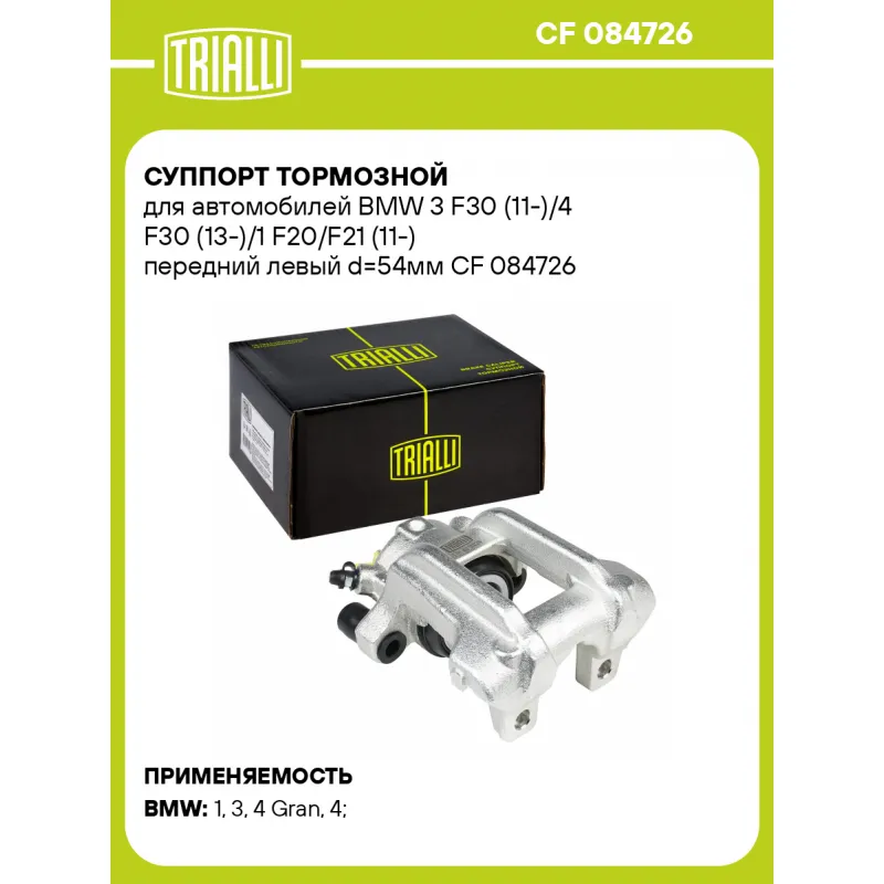 Суппорт тормозной для автомобилей BMW 3 F30 (11-)/4 F30 (13-)/1 F20/F21 (11-) передний левый d=54мм Характеристики: Артикул: CF 084726 OEM номера: 34 11 6 850 649 Гарантийный срок: 2 года / 60 000 км Сопутствующий товар: Ремкомплект суппорта: RCF 084726 Сопутствующий товар: Поршень суппорта: RCF 084726P Сопутствующий товар: Скоба суппорта: CF 084795 Сопутствующий товар: Суппорт тормозной: CF 084727 Парный товар: CF 084727 Количество на автомобиль: 1 Диаметр, мм: 54 Количество поршней: 1 Толщина тормозного диска, мм: 22 Тормозная система: BOSCH Сторона установки: Передняя ось слева Товарная линейка: BLACK Комплектация: Скоба дискового тормозного механизма (суппорт тормозной без направляющей колодок) - 1 шт Гарантия: от 1 года.