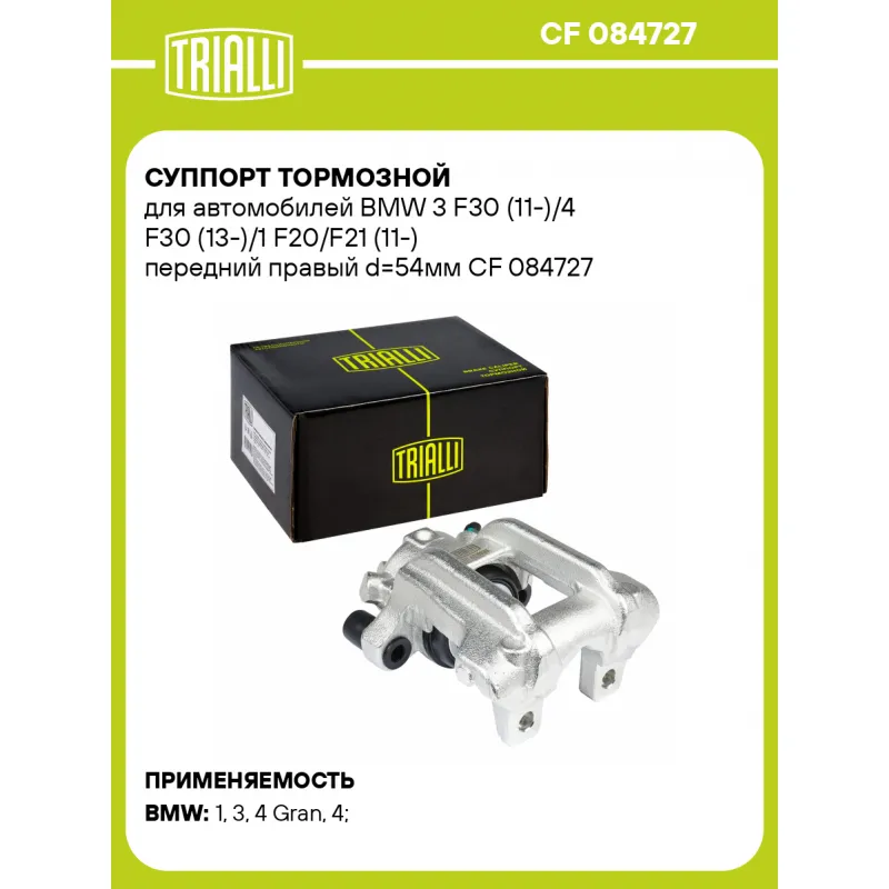 Суппорт тормозной для автомобилей BMW 3 F30 (11-)/4 F30 (13-)/1 F20/F21 (11-) передний правый d=54мм Характеристики: Артикул: CF 084727 OEM номера: 34 11 6 850 650 Сопутствующий товар: Ремкомплект суппорта: RCF 084726 Сопутствующий товар: Поршень суппорта: RCF 084726P Сопутствующий товар: Скоба суппорта: CF 084795 Сопутствующий товар: Суппорт тормозной: CF 084726 Парный товар: CF 084726 Количество на автомобиль: 1 Диаметр, мм: 54 Количество поршней: 1 Гарантийный срок: 2 года / 60 000 км Толщина тормозного диска, мм: 22 Тормозная система: BOSCH Сторона установки: Передняя ось справа Товарная линейка: BLACK Комплектация: Скоба дискового тормозного механизма (суппорт тормозной без направляющей колодок) - 1 шт Гарантия: от 1 года.