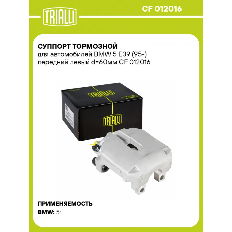 Суппорт тормозной для автомобилей BMW 5 E39 (95-) передний левый d=60мм Характеристики: Артикул: CF 012016 OEM номера: 34 11 1 163 385 Гарантийный срок: 2 года / 60 000 км Сопутствующий товар: Ремкомплект суппорта: RCF 012016 Сопутствующий товар: Поршень суппорта: RCF 012016P Сопутствующий товар: Скоба суппорта: CF 012018 Сопутствующий товар: Суппорт тормозной: CF 012017 Парный товар: CF 012017 Количество на автомобиль: 1 Диаметр, мм: 60 Количество поршней: 1 Толщина тормозного диска, мм: 22 Тормозная система: ATE Сторона установки: Передняя ось слева Товарная линейка: BLACK Комплектация: Скоба дискового тормозного механизма (суппорт тормозной без направляющей колодок) - 1 шт Гарантия: от 1 года.