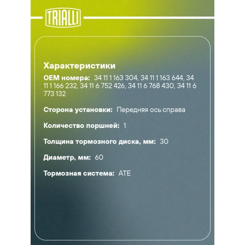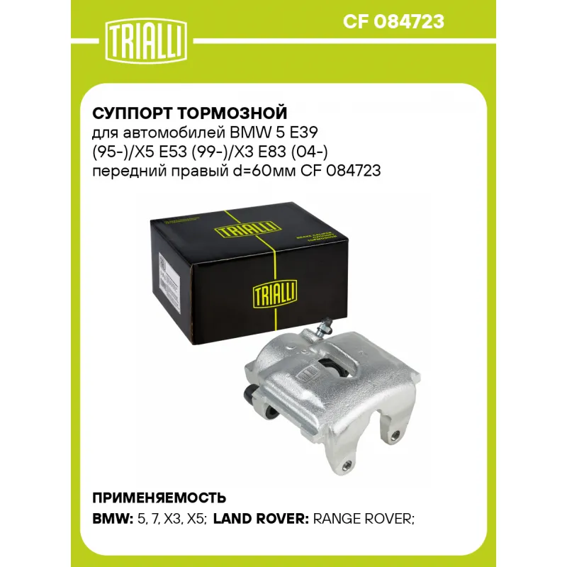 Суппорт тормозной для автомобилей BMW 5 E39 (95-)/X5 E53 (99-)/X3 E83 (04-) передний правый d=60мм Характеристики: Артикул: CF 084723 OEM номера: 34 11 1 163 304, 34 11 1 163 644, 34 11 1 166 232, 34 11 6 752 426, 34 11 6 768 430, 34 11 6 773 132 Гарантийный срок: 2 года / 60 000 км Сопутствующий товар: Ремкомплект суппорта: RCF 084722 Сопутствующий товар: Поршень суппорта: RCF 084722P Сопутствующий товар: Скоба суппорта: CF 084797 Сопутствующий товар: Суппорт тормозной: CF 084722 Парный товар: CF 084722 Количество на автомобиль: 1 Диаметр, мм: 60 Количество поршней: 1 Толщина тормозного диска, мм: 30 Тормозная система: ATE Сторона установки: Передняя ось справа Товарная линейка: BLACK Комплектация: Скоба дискового тормозного механизма (суппорт тормозной без направляющей колодок) - 1 шт Гарантия: от 1 года.