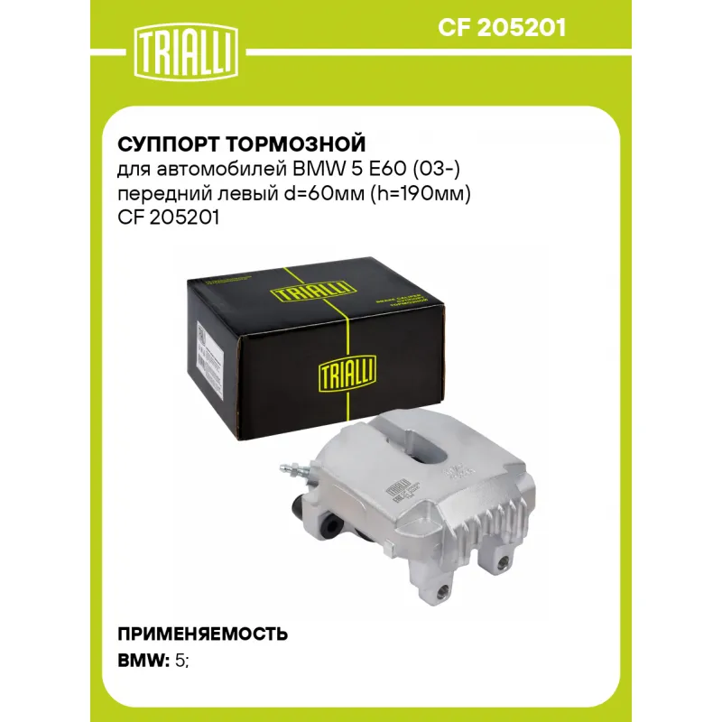Суппорт тормозной для автомобилей BMW 5 E60 (03-) передний левый d=60мм (h=190мм) Характеристики: Артикул: CF 205201 OEM номера: 34 11 6 763 023 Тормозная система: ATE Диаметр, мм: 60 Гарантийный срок: 2 года / 60 000 км Количество поршней: 1 Толщина тормозного диска, мм: 24 Сторона установки: Передняя ось слева Парный товар: CF 205202 Количество на автомобиль: 1 Товарная линейка: BLACK Комплектация: Скоба дискового тормозного механизма (суппорт тормозной без направляющей колодок) - 1 шт Гарантия: от 1 года.