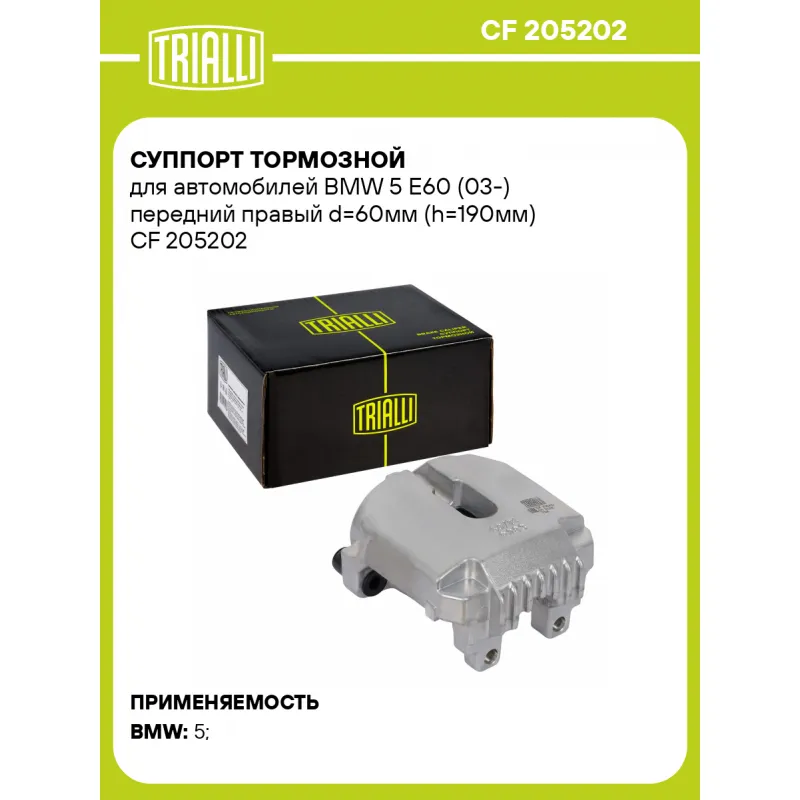 Суппорт тормозной для автомобилей BMW 5 E60 (03-) передний правый d=60мм (h=190мм) Характеристики: Артикул: CF 205202 OEM номера: 34 11 6 763 024 Тормозная система: ATE Диаметр, мм: 60 Гарантийный срок: 2 года / 60 000 км Количество поршней: 1 Толщина тормозного диска, мм: 24 Сторона установки: Передняя ось справа Парный товар: CF 205201 Количество на автомобиль: 1 Товарная линейка: BLACK Комплектация: Скоба дискового тормозного механизма (суппорт тормозной без направляющей колодок) - 1 шт Гарантия: от 1 года.