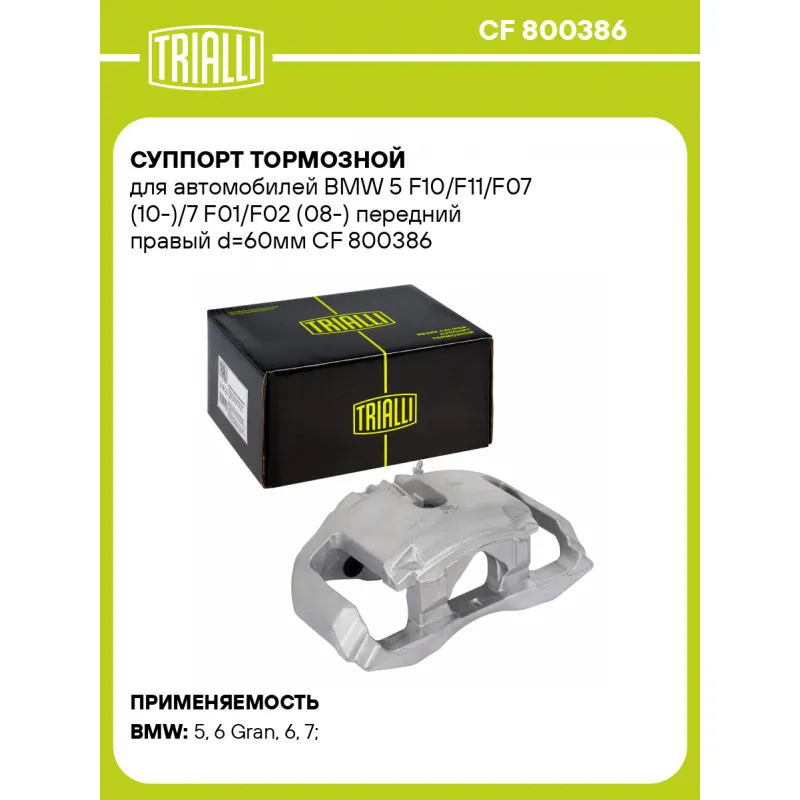 Суппорт тормозной для автомобилей BMW 5 F10/F11/F07 (10-)/7 F01/F02 (08-) передний правый d=60мм Характеристики: Артикул: CF 800386 OEM номера: 34 11 6 786 818 Тормозная система: ATE Диаметр, мм: 60 Гарантийный срок: 2 года / 60 000 км Количество поршней: 1 Толщина тормозного диска, мм: 36 Сторона установки: Передняя ось справа Парный товар: CF 800385 Количество на автомобиль: 1 Товарная линейка: BLACK Комплектация: Скоба дискового тормозного механизма (суппорт тормозной без направляющей колодок) - 1 шт Гарантия: от 1 года.