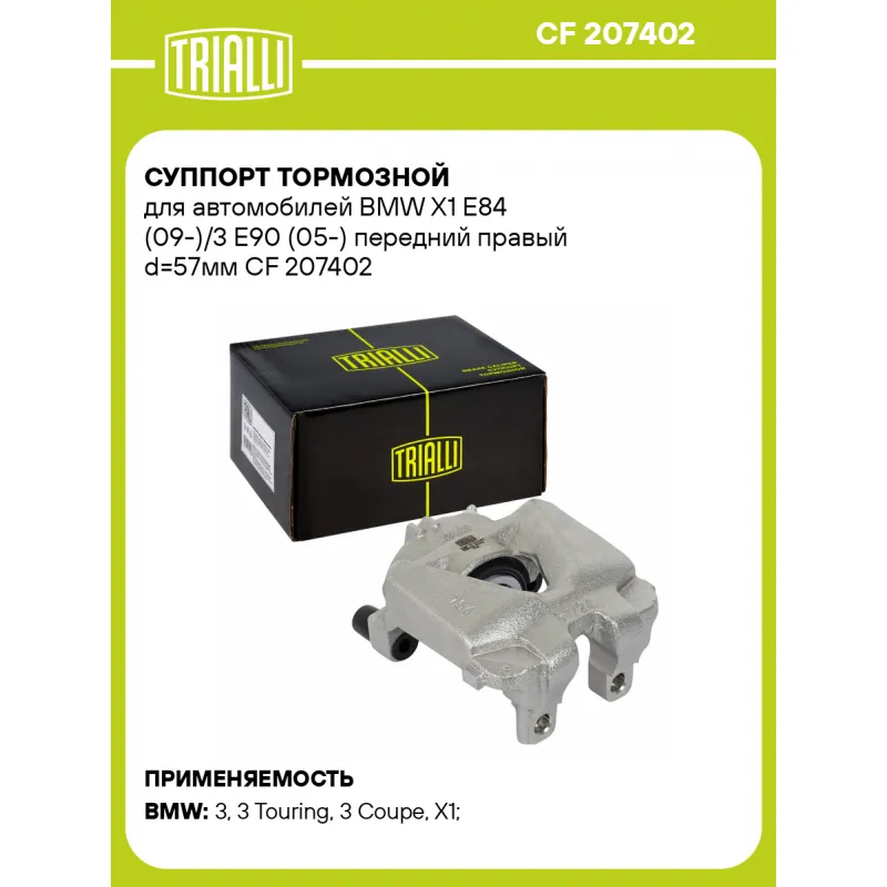 Суппорт тормозной для автомобилей BMW X1 E84 (09-)/3 E90 (05-) передний правый d=57мм Характеристики: Артикул: CF 207402 OEM номера: 34 11 6 778 146 Тормозная система: ATE Диаметр, мм: 57 Гарантийный срок: 2 года / 60 000 км Количество поршней: 1 Толщина тормозного диска, мм: 24 Сторона установки: Передняя ось справа Парный товар: CF 207401 Количество на автомобиль: 1 Товарная линейка: BLACK Комплектация: Скоба дискового тормозного механизма (суппорт тормозной без направляющей колодок) - 1 шт Гарантия: от 1 года.