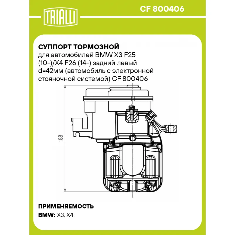 Суппорт тормозной для автомобилей BMW X3 F25 (10-)/X4 F26 (14-) задний левый d=42мм (автомобиль с электронной стояночной системой) Характеристики: Артикул: CF 800406 OEM номера: 34 21 6 791 017 Особенности конструкции:: Для автомобилей с электрическим стояночным тормозом Тормозная система: TRW Диаметр, мм: 42 Гарантийный срок: 2 года / 60 000 км Количество поршней: 1 Толщина тормозного диска, мм: 20 Сторона установки: Задняя ось слева Сопутствующий товар: Ремкомплект суппорта: RCF 800406 Сопутствующий товар: Поршень суппорта: RCF 800407 Сопутствующий товар: Скоба суппорта: CF 800408 Сопутствующий товар: Электродвигатель суппорта: RCM 800408 Сопутствующий товар: Суппорт тормозной: CF 800407 Диаметр тормозного диска, мм: 330 Парный товар: CF 800407 Количество на автомобиль: 1 Товарная линейка: BLACK Комплектация: Скоба дискового тормозного механизма (суппорт тормозной без направляющей колодок) - 1 шт Гарантия: от 1 года.