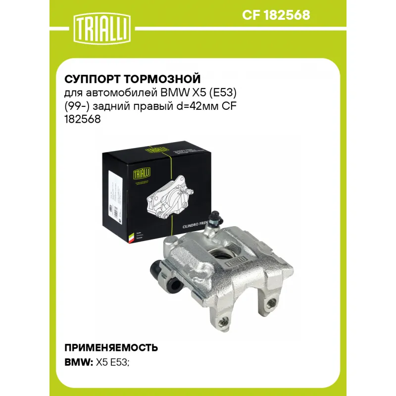 Суппорт тормозной для автомобилей BMW X5 (E53) (99-) задний правый d=42мм Характеристики: Артикул: CF 182568 OEM номера: 34216768444, 34 21 1 166 236 Сопутствующий товар: Ремкомплект суппорта: RCF 182567 Сопутствующий товар: Поршень суппорта: RCF 182568 Сопутствующий товар: Суппорт тормозной: CF 182567 Парный товар: CF 182567 Количество на автомобиль: 1 Диаметр, мм: 42 Количество поршней: 1 Гарантийный срок: 2 года / 60 000 км Толщина тормозного диска, мм: 12 Тормозная система: ATE Сторона установки: Задняя ось справа Товарная линейка: BLACK Подходит для авто: BMW X5 E53 (99-), X5 E53 (99-), X5 E53 (99-) Для проверки применяемости отправьте VIN автомобиля через вкладку "Есть вопросы о товаре?" Комплектация: Скоба дискового тормозного механизма (суппорт тормозной без направляющей колодок) - 1 шт Гарантия: от 1 года.