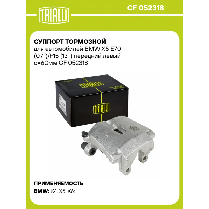 Суппорт тормозной для автомобилей BMW X5 E70 (07-)/F15 (13-) передний левый d=60мм Характеристики: Артикул: CF 052318 OEM номера: 34 11 6 776 783 Гарантийный срок: 2 года / 60 000 км Сопутствующий товар: Ремкомплект суппорта: RCF 052318 Сопутствующий товар: Поршень суппорта: RCF 052318P Сопутствующий товар: Скоба суппорта: CF 052303 Сопутствующий товар: Суппорт тормозной: CF 052319 Парный товар: CF 052319 Количество на автомобиль: 1 Диаметр, мм: 60 Количество поршней: 1 Толщина тормозного диска, мм: 30 Тормозная система: ATE Сторона установки: Передняя ось слева Товарная линейка: BLACK Комплектация: Скоба дискового тормозного механизма (суппорт тормозной без направляющей колодок) - 1 шт Гарантия: от 1 года.