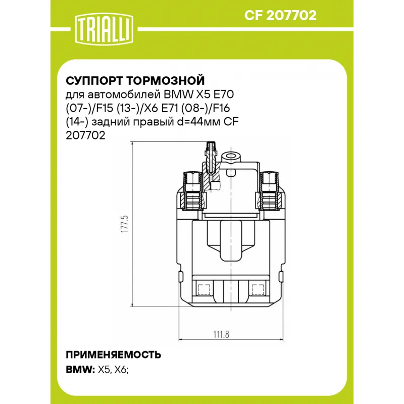 Суппорт тормозной для автомобилей BMW X5 E70 (07-)/F15 (13-)/X6 E71 (08-)/F16 (14-) задний правый d=44мм Характеристики: Артикул: CF 207702 OEM номера: 34 21 6 776 788 Тормозная система: ATE Диаметр, мм: 44 Гарантийный срок: 2 года / 60 000 км Количество поршней: 1 Толщина тормозного диска, мм: 20 Сторона установки: Задняя ось с... Читать полностью →