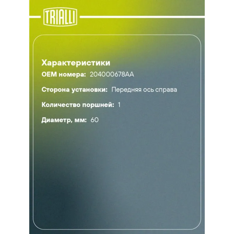 Суппорт тормозной для автомобилей Chery Tiggo 7 Pro (20-)/Xcite X-Cross 7 (24-) передний правый d=60мм Характеристики: Артикул: CF 800182 OEM номера: 204000678AA Диаметр, мм: 60 Гарантийный срок: 2 года / 60 000 км Количество поршней: 1 Сторона установки: Передняя ось справа Сопутствующий товар: Ремкомплект суппорта: RCF 800181 ... Читать полностью →