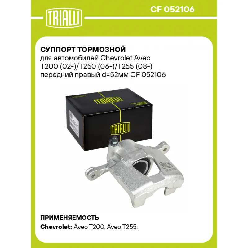 Суппорт тормозной для автомобилей Chevrolet Aveo T200 (02-)/T250 (06-)/T255 (08-) передний правый d=52мм Характеристики: Артикул: CF 052106 OEM номера: 96534638, 94566891, 42365534, 42365538 Сопутствующий товар: Ремкомплект суппорта: RCF 052105 Сопутствующий товар: Поршень суппорта: RCF 052106 Сопутствующий товар: Скоба суппорта: CF 105070 Сопутствующий товар: Суппорт тормозной: CF 052105 Количество на автомобиль: 1 Диаметр, мм: 52 Количество поршней: 1 Гарантийный срок: 2 года / 60 000 км Толщина тормозного диска, мм: 20 Тормозная система: DAC Сторона установки: Передняя ось справа Товарная линейка: BLACK Подходит для авто: Chevrolet Aveo T200 (02-), Aveo T255 (08-), Aveo T250 (06-), Aveo T200 (02-) Для проверки применяемости отправьте VIN автомобиля через вкладку "Есть вопросы о товаре?" Комплектация: Скоба дискового тормозного механизма (суппорт тормозной без направляющей колодок) - 1 шт Гарантия: от 1 года.