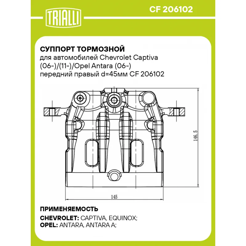 Суппорт тормозной для автомобилей Chevrolet Captiva (06-)/(11-)/Opel Antara (06-) передний правый d=45мм Характеристики: Артикул: CF 206102 OEM номера: 25964183, 96626068, 96625937, 4808844, 4808860, 4814331 Тормозная система: MANDO Диаметр, мм: 45 Гарантийный срок: 2 года / 60 000 км Количество поршней: 2 Толщина тормозного диска, мм: 29 Сторона установки: Передняя ось справа Сопутствующий товар: Ремкомплект суппорта: RCF 206101 Сопутствующий товар: Поршень суппорта: RCF 206102 Сопутствующий товар: Скоба суппорта: CF 206103 Сопутствующий товар: Суппорт тормозной: CF 206101 Парный товар: CF 206101 Количество на автомобиль: 1 Товарная линейка: BLACK Комплектация: Скоба дискового тормозного механизма (суппорт тормозной без направляющей колодок) - 1 шт Гарантия: от 1 года.