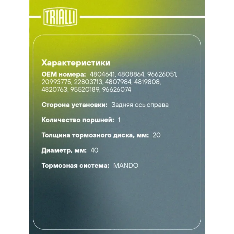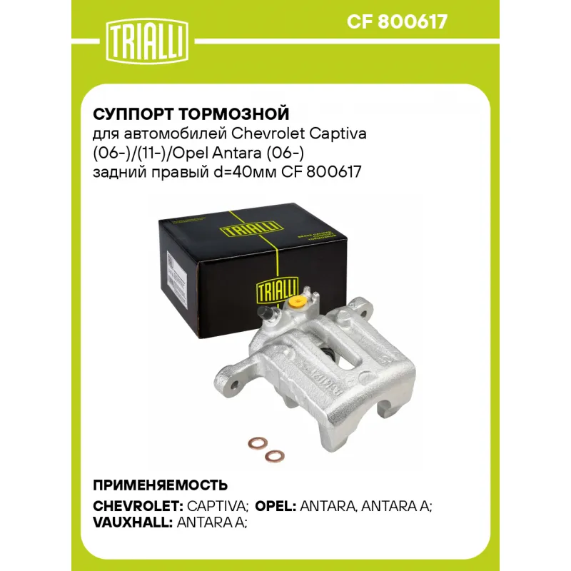 Суппорт тормозной для автомобилей Chevrolet Captiva (06-)/(11-)/Opel Antara (06-) задний правый d=40мм Характеристики: Артикул: CF 800617 OEM номера: 4804641, 4808864, 96626051, 20993775, 22803713, 4807984, 4819808, 4820763, 95520189, 96626074 Тормозная система: MANDO Диаметр, мм: 40 Гарантийный срок: 2 года / 60 000 км Количество поршней: 1 Толщина тормозного диска, мм: 20 Сторона установки: Задняя ось справа Сопутствующий товар: Ремкомплект суппорта: RCF 800616 Сопутствующий товар: Поршень суппорта: RCF 800617 Сопутствующий товар: Скоба суппорта: CF 800618 Сопутствующий товар: Суппорт тормозной: CF 800616 Диаметр тормозного диска, мм: 303 Парный товар: CF 800616 Количество на автомобиль: 1 Товарная линейка: BLACK Комплектация: Скоба дискового тормозного механизма (суппорт тормозной без направляющей колодок) - 1 шт Гарантия: от 1 года.