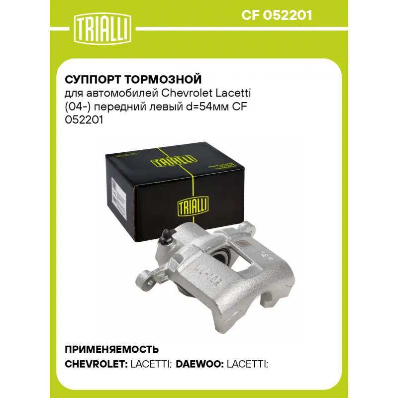 Суппорт тормозной для автомобилей Chevrolet Lacetti (04-) передний левый d=54мм Характеристики: Артикул: CF 052201 OEM номера: 96250029, 96391880, 96418871, 96549788, 96249284, 96268460 Сопутствующий товар: Ремкомплект суппорта: RCF 052201 Сопутствующий товар: Поршень суппорта: RCF 052202 Сопутствующий товар: Скоба суппорта: CF 052203 Сопутствующий товар: Суппорт тормозной: CF 052202 Парный товар: CF 052202 Количество на автомобиль: 1 Диаметр, мм: 54 Количество поршней: 1 Гарантийный срок: 2 года / 60 000 км Толщина тормозного диска, мм: 24 Тормозная система: DAC Сторона установки: Передняя ось слева Товарная линейка: BLACK Комплектация: Скоба дискового тормозного механизма (суппорт тормозной без направляющей колодок) - 1 шт Гарантия: от 1 года.