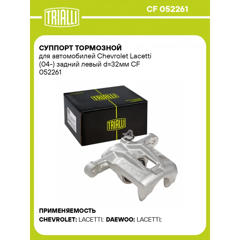 Суппорт тормозной для автомобилей Chevrolet Lacetti (04-) задний левый d=32мм Характеристики: Артикул: CF 052261 OEM номера: 96418879, 96463798, 96549622 Сопутствующий товар: Ремкомплект суппорта: RCF 052261 Сопутствующий товар: Поршень суппорта: RCF 052262 Сопутствующий товар: Скоба суппорта: CF 052263 Сопутствующий товар: Суппорт тормозной: CF 052262 Парный товар: CF 052262 Количество на автомобиль: 1 Диаметр, мм: 32 Количество поршней: 1 Гарантийный срок: 2 года / 60 000 км Толщина тормозного диска, мм: 10 Тормозная система: DAC Сторона установки: Задняя ось слева Товарная линейка: BLACK Комплектация: Скоба дискового тормозного механизма (суппорт тормозной без направляющей колодок) - 1 шт Гарантия: от 1 года.