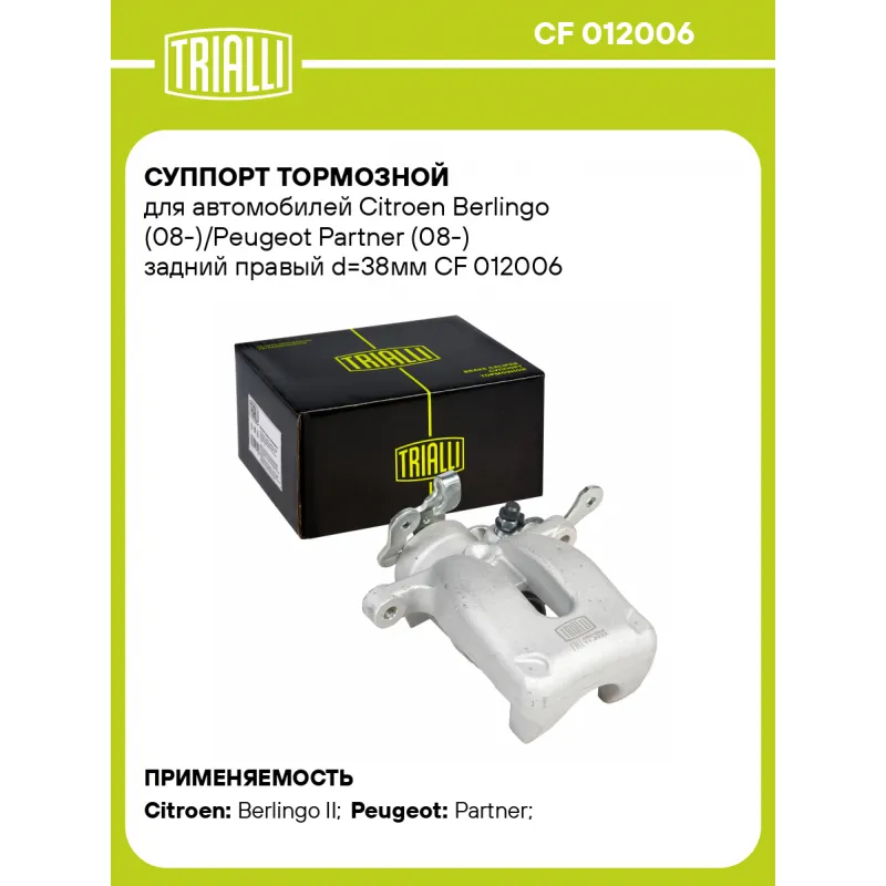 Суппорт тормозной для автомобилей Citroen Berlingo (08-)/Peugeot Partner (08-) задний правый d=38мм Характеристики: Артикул: CF 012006 OEM номера: 4402.F6 Сопутствующий товар: Ремкомплект суппорта: RCF 012005 Сопутствующий товар: Поршень суппорта: RCF 012006 Сопутствующий товар: Суппорт тормозной: CF 012005 Диаметр тормозного диска, мм: 268 Парный товар: CF 012005 Количество на автомобиль: 1 Диаметр, мм: 38 Количество поршней: 1 Гарантийный срок: 2 года / 60 000 км Толщина тормозного диска, мм: 12 Тормозная система: TRW Сторона установки: Задняя ось справа Товарная линейка: BLACK Подходит для авто: Citroen Berlingo II (08-) Peugeot Partner (08-), Partner (08-) Для проверки применяемости отправьте VIN автомобиля через вкладку "Есть вопросы о товаре?" Комплектация: Скоба дискового тормозного механизма (суппорт тормозной без направляющей колодок) - 1 шт Гарантия: от 1 года.