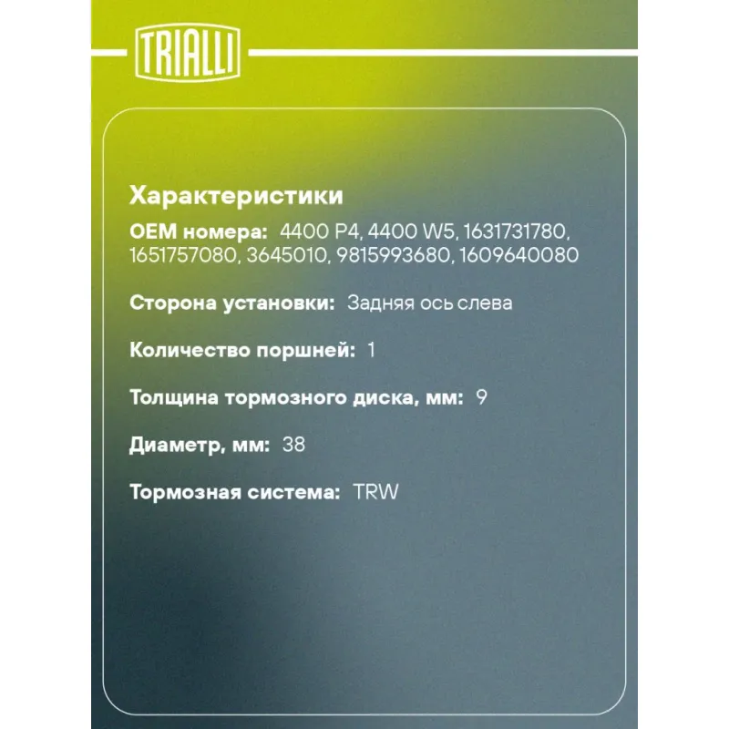 Суппорт тормозной для автомобилей Citroen C3 (02-)/C2 (03-)/Peugeot 207 (06-) задний левый d=38мм Характеристики: Артикул: CF 103563 OEM номера: 4400 P4, 4400 W5, 1631731780, 1651757080, 3645010, 9815993680, 1609640080 Гарантийный срок: 2 года / 60 000 км Сопутствующий товар: Ремкомплект суппорта: RCF 103563 Сопутствующий товар: Поршень суппорта: RCF 103564 Сопутствующий товар: Скоба суппорта: CF 032020 Сопутствующий товар: Суппорт тормозной: CF 103564 Парный товар: CF 103564 Количество на автомобиль: 1 Диаметр, мм: 38 Количество поршней: 1 Толщина тормозного диска, мм: 9 Тормозная система: TRW Сторона установки: Задняя ось слева Товарная линейка: BLACK Комплектация: Скоба дискового тормозного механизма (суппорт тормозной без направляющей колодок) - 1 шт Гарантия: от 1 года.