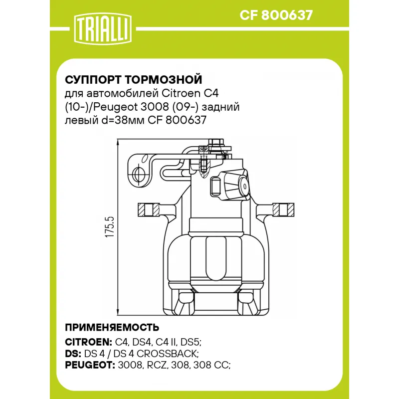 Суппорт тормозной для автомобилей Citroen C4 (10-)/Peugeot 3008 (09-) задний левый d=38мм Характеристики: Артикул: CF 800637 OEM номера: 4401 Q0 Тормозная система: TRW Диаметр, мм: 38 Гарантийный срок: 2 года / 60 000 км Количество поршней: 1 Толщина тормозного диска, мм: 12 Сторона установки: Задняя ось слева Сопутствующий товар: Ремкомплект суппорта: RCF 800637 Сопутствующий товар: Поршень суппорта: RCF 800638 Сопутствующий товар: Скоба суппорта: CF 800639 Сопутствующий товар: Суппорт тормозной: CF 800638 Диаметр тормозного диска, мм: 268 Парный товар: CF 800638 Количество на автомобиль: 1 Товарная линейка: BLACK Комплектация: Скоба дискового тормозного механизма (суппорт тормозной без направляющей колодок) - 1 шт Гарантия: от 1 года.