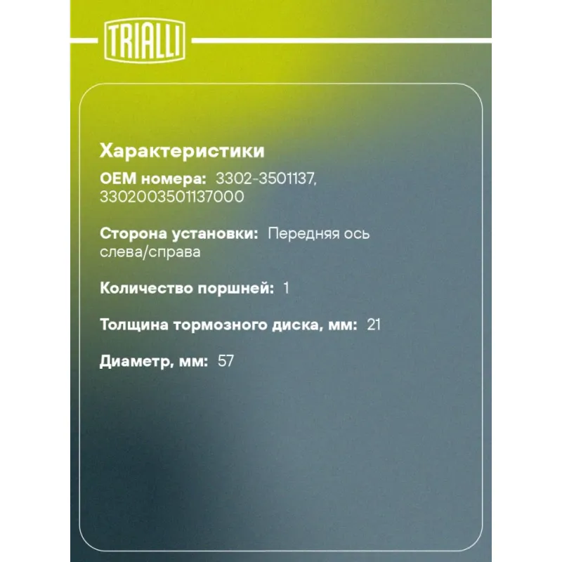Суппорт тормозной для автомобилей ГАЗ 3302 левый/3110 правый передний d=57мм (в сборе со скобой) Характеристики: Артикул: CF 403 OEM номера: 3302-3501137, 3302003501137000 Сопутствующий товар: Ремкомплект суппорта: RCF 413 Сопутствующий товар: Поршень суппорта: RCF 414 Сопутствующий товар: Скоба суппорта: CF 350149 Сопутствующий товар: Суппорт тормозной: CF 402 Количество на автомобиль: 1 Диаметр, мм: 57 Особенности конструкции:: ГАЗ 3302 - передний левый, ГАЗ 3110 - передний правый Количество поршней: 1 Гарантийный срок: 2 года / 60 000 км Толщина тормозного диска, мм: 21 Сторона установки: Передняя ось слева/справа Товарная линейка: BLACK Подходит для авто: ГАЗ 3110, 31105, 3102, 31029, 31029, Gazelle, 3302, 3302, 3302, 3110, 3110, 3110, 3110, 31105, 31105, 31105, 31105, 3102, 3102, 3102, 3102, 31029, Gazelle, 3302, 3302, 3302, 33025, 33025, 33027, 33027, Gazelle-Business, Gazelle-Business, Gazelle-Business, Gazelle-Next (13-), Gazelle-Next (13-) Для проверки применяемости отправьте VIN автомобиля через вкладку "Есть вопросы о товаре?" Комплектация: Скоба дискового тормозного механизма (суппорт тормозной в сборе с направляющей колодок) - 1 шт Гарантия: от 1 года.