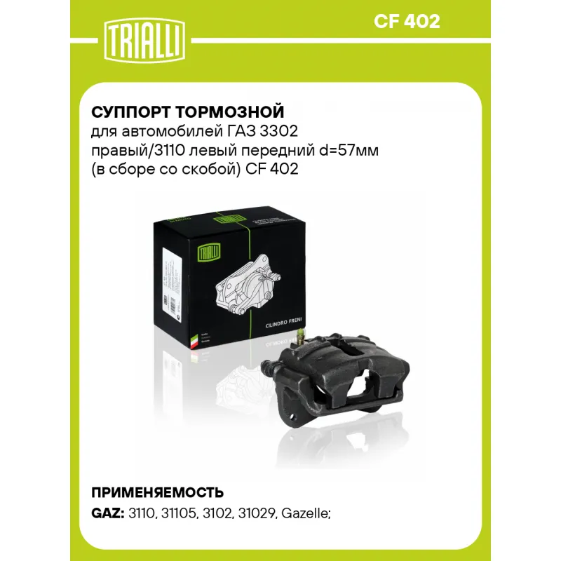 Суппорт тормозной для автомобилей ГАЗ 3302 правый/3110 левый передний d=57мм (в сборе со скобой) Характеристики: Артикул: CF 402 OEM номера: 3302-3501136, 3302003501136000 Сопутствующий товар: Ремкомплект суппорта: RCF 413 Сопутствующий товар: Поршень суппорта: RCF 414 Сопутствующий товар: Скоба суппорта: CF 350149 Сопутствующий товар: Суппорт тормозной: CF 403 Количество на автомобиль: 1 Диаметр, мм: 57 Особенности конструкции:: ГАЗ 3302 - передний правый, ГАЗ 3110 - передний левый Количество поршней: 1 Гарантийный срок: 2 года / 60 000 км Толщина тормозного диска, мм: 21 Сторона установки: Передняя ось слева/справа Товарная линейка: BLACK Подходит для авто: ГАЗ 3110, 31105, 3102, 31029, 31029, Gazelle, 3302, 3302, 3302, 3110, 3110, 3110, 3110, 31105, 31105, 31105, 31105, 3102, 3102, 3102, 3102, 31029, Gazelle, 3302, 3302, 3302, 33025, 33025, 33027, 33027, Gazelle-Business, Gazelle-Business, Gazelle-Business, Gazelle-Next (13-), Gazelle-Next (13-) Для проверки применяемости отправьте VIN автомобиля через вкладку "Есть вопросы о товаре?" Комплектация: Скоба дискового тормозного механизма (суппорт тормозной в сборе с направляющей колодок) - 1 шт Гарантия: от 1 года.
