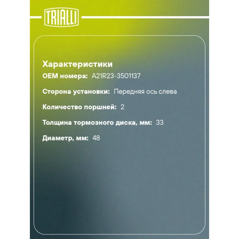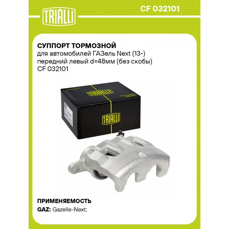 Суппорт тормозной для автомобилей ГАЗель Next (13-) передний левый d=48мм (без скобы) Характеристики: Артикул: CF 032101 OEM номера: A21R23-3501137 Сторона установки: Передняя ось слева Сопутствующий товар: Ремкомплект суппорта: RCF 032101 Сопутствующий товар: Поршень суппорта: RCF 032102 Сопутствующий товар: Скоба суппорта: CF 032192 Сопутствующий товар: Суппорт тормозной: CF 032102 Парный товар: CF 032102 Количество на автомобиль: 1 Диаметр, мм: 48 Количество поршней: 2 Гарантийный срок: 2 года / 60 000 км Толщина тормозного диска, мм: 33 Товарная линейка: BLACK Подходит для авто: ГАЗ Gazelle-Next (13-), Gazelle-Next (13-) Для проверки применяемости отправьте VIN автомобиля через вкладку "Есть вопросы о товаре?" Комплектация: Скоба дискового тормозного механизма (суппорт тормозной без направляющей колодок) - 1 шт Гарантия: от 1 года.
