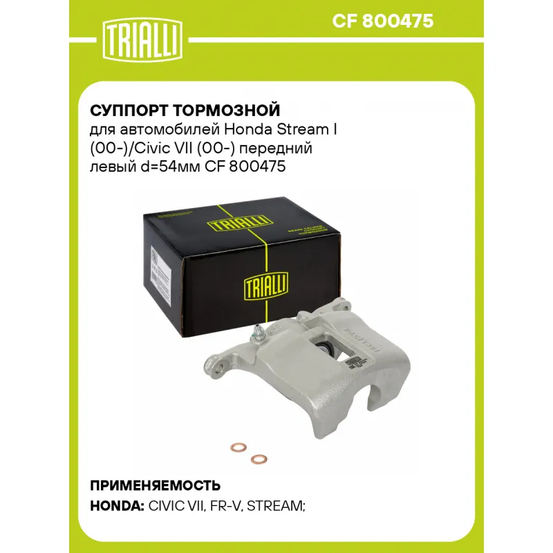 Суппорт тормозной для автомобилей Honda Stream I (00-)/Civic VII (00-) передний левый d=54мм Характеристики: Артикул: CF 800475 OEM номера: 45019SJFJ00, 45019S7AN02 Тормозная система: NISSIN Диаметр, мм: 54 Гарантийный срок: 2 года / 60 000 км Количество поршней: 1 Толщина тормозного диска, мм: 23.6 Сторона установки: Передняя ось слева Сопутствующий товар: Ремкомплект суппорта: RCF 800475 Сопутствующий товар: Поршень суппорта: RCF 800476 Сопутствующий товар: Скоба суппорта: CF 800477 Сопутствующий товар: Суппорт тормозной: CF 800476 Парный товар: CF 800476 Количество на автомобиль: 1 Товарная линейка: BLACK Комплектация: Скоба дискового тормозного механизма (суппорт тормозной без направляющей колодок) - 1 шт Гарантия: от 1 года.