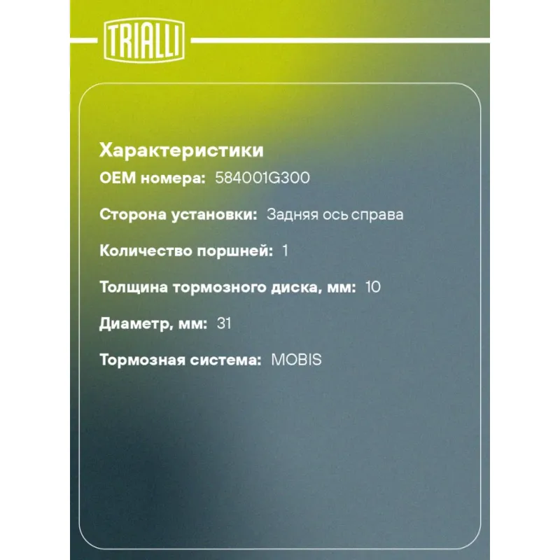 Суппорт тормозной для автомобилей Hyundai Accent (05-)/Kia Rio II (05-) задний правый d=31мм Характеристики: Артикул: CF 084718 OEM номера: 584001G300 Сопутствующий товар: Ремкомплект суппорта: RCF 084717 Сопутствующий товар: Поршень суппорта: RCF 084718 Сопутствующий товар: Суппорт тормозной: CF 084717 Парный товар: CF 084717 Количество на автомобиль: 1 Диаметр, мм: 31 Количество поршней: 1 Гарантийный срок: 2 года / 60 000 км Толщина тормозного диска, мм: 10 Тормозная система: MOBIS Сторона установки: Задняя ось справа Товарная линейка: BLACK Подходит для авто: Kia Rio II (05-), Rio II (05-) Hyundai Accent III (05-) Для проверки применяемости отправьте VIN автомобиля через вкладку "Есть вопросы о товаре?" Комплектация: Скоба дискового тормозного механизма (суппорт тормозной без направляющей колодок) - 1 шт Гарантия: от 1 года.