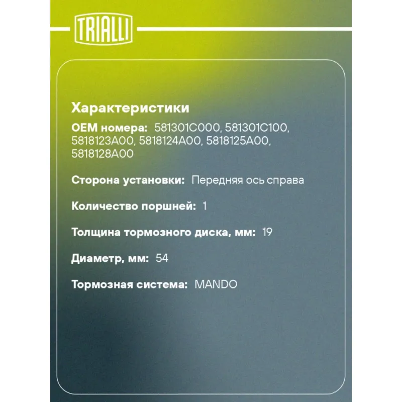 Суппорт тормозной для автомобилей Hyundai Accent (99-)/Getz (02-) передний правый d=54мм Характеристики: Артикул: CF 084704 OEM номера: 581301C000, 581301C100, 5818123A00, 5818124A00, 5818125A00, 5818128A00 Сопутствующий товар: Ремкомплект суппорта: RCF 084703 Сопутствующий товар: Поршень суппорта: RCF 084704 Сопутствующий товар: Суппорт тормозной: CF 084703 Парный товар: CF 084703 Количество на автомобиль: 1 Диаметр, мм: 54 Количество поршней: 1 Гарантийный срок: 2 года / 60 000 км Толщина тормозного диска, мм: 19 Тормозная система: MANDO Сторона установки: Передняя ось справа Товарная линейка: BLACK Подходит для авто: Hyundai Accent II (99-), Accent II (99-), Accent II (TagAZ) (01-), Getz (02-) Для проверки применяемости отправьте VIN автомобиля через вкладку "Есть вопросы о товаре?" Комплектация: Скоба дискового тормозного механизма (суппорт тормозной без направляющей колодок) - 1 шт Гарантия: от 1 года.