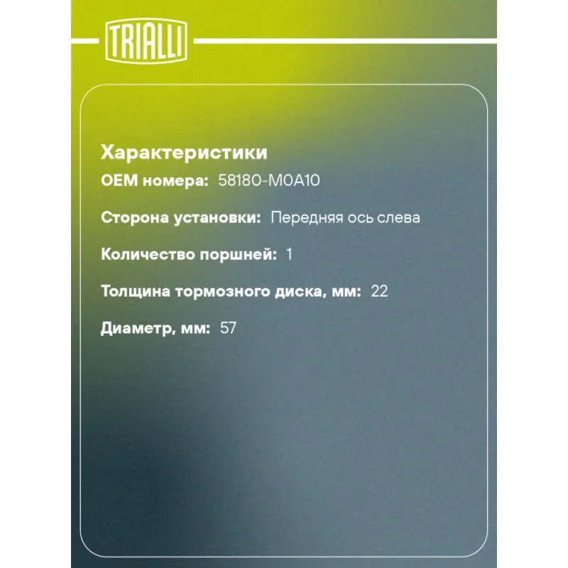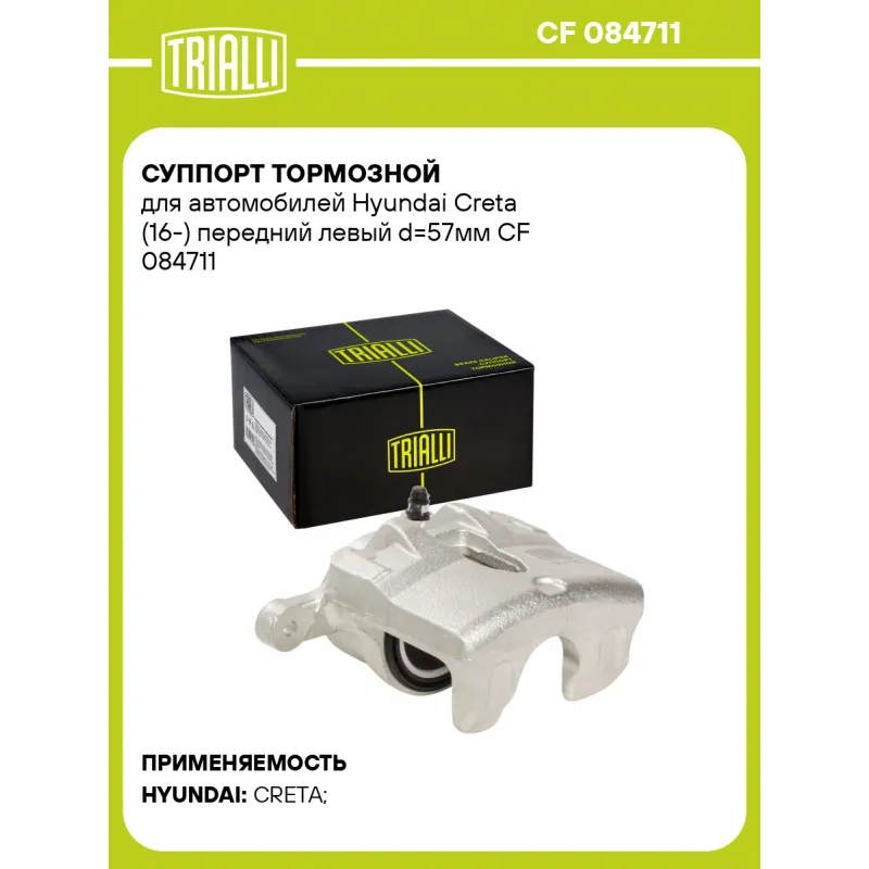 Суппорт тормозной для автомобилей Hyundai Creta (16-) передний левый d=57мм Характеристики: Артикул: CF 084711 OEM номера: 58180-M0A10 Сопутствующий товар: Ремкомплект суппорта: RCF 084711 Сопутствующий товар: Поршень суппорта: RCF 084712 Сопутствующий товар: Скоба суппорта: CF 084794 Сопутствующий товар: Суппорт тормозной: CF 084712 Парный товар: CF 084712 Количество на автомобиль: 1 Диаметр, мм: 57 Количество поршней: 1 Гарантийный срок: 2 года / 60 000 км Толщина тормозного диска, мм: 22 Сторона установки: Передняя ось слева Товарная линейка: BLACK Комплектация: Скоба дискового тормозного механизма (суппорт тормозной без направляющей колодок) - 1 шт Гарантия: от 1 года.