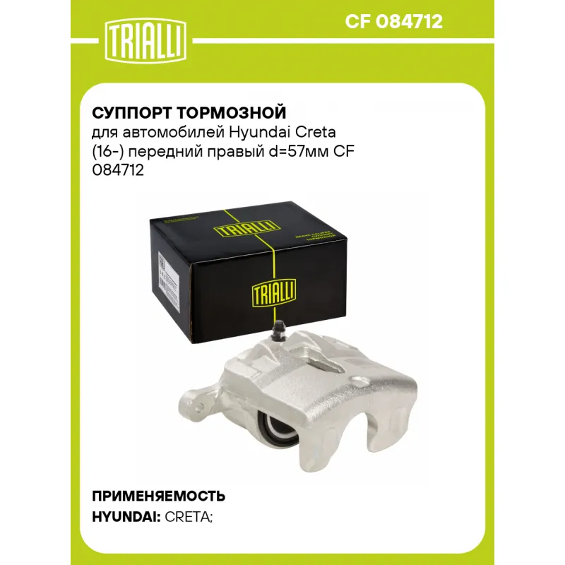 Суппорт тормозной для автомобилей Hyundai Creta (16-) передний правый d=57мм Характеристики: Артикул: CF 084712 OEM номера: 58190-M0A10 Сопутствующий товар: Ремкомплект суппорта: RCF 084711 Сопутствующий товар: Поршень суппорта: RCF 084712 Сопутствующий товар: Скоба суппорта: CF 084794 Сопутствующий товар: Суппорт тормозной: CF 084711 Парный товар: CF 084711 Количество на автомобиль: 1 Диаметр, мм: 57 Количество поршней: 1 Гарантийный срок: 2 года / 60 000 км Толщина тормозного диска, мм: 22 Сторона установки: Передняя ось справа Товарная линейка: BLACK Комплектация: Скоба дискового тормозного механизма (суппорт тормозной без направляющей колодок) - 1 шт Гарантия: от 1 года.