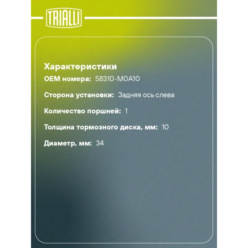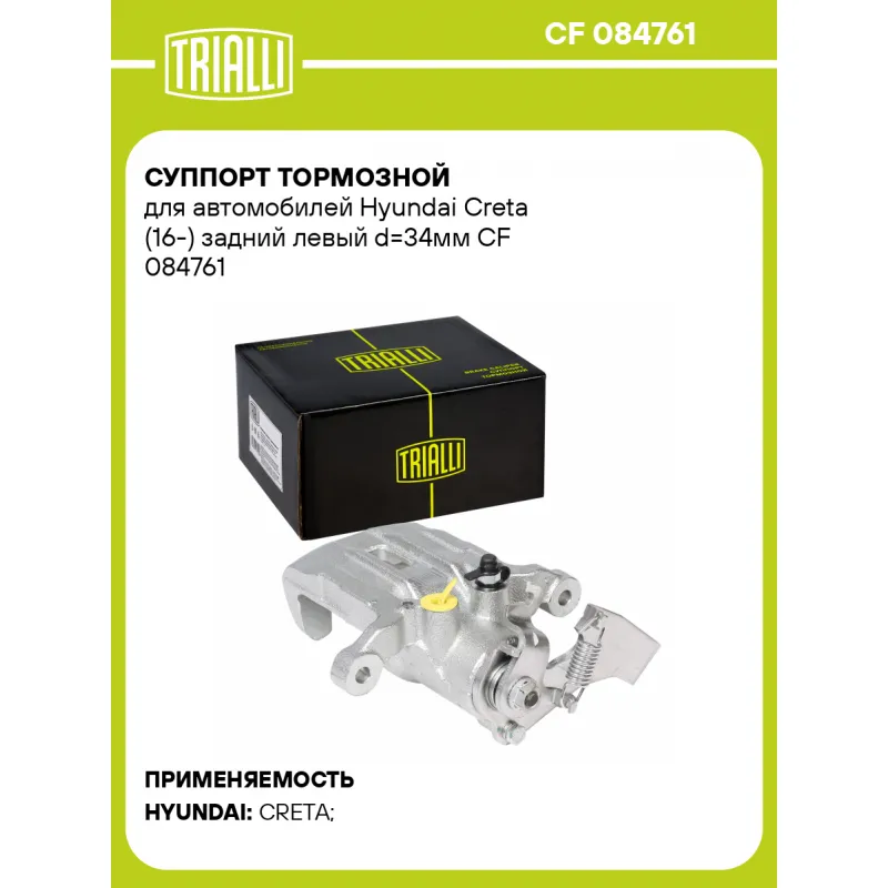 Суппорт тормозной для автомобилей Hyundai Creta (16-) задний левый d=34мм Характеристики: Артикул: CF 084761 OEM номера: 58310-M0A10 Сопутствующий товар: Ремкомплект суппорта: RCF 084761 Сопутствующий товар: Поршень суппорта: RCF 084762 Сопутствующий товар: Скоба суппорта: CF 084792 Сопутствующий товар: Суппорт тормозной: CF 084762 Парный товар: CF 084762 Количество на автомобиль: 1 Диаметр, мм: 34 Количество поршней: 1 Гарантийный срок: 2 года / 60 000 км Толщина тормозного диска, мм: 10 Сторона установки: Задняя ось слева Товарная линейка: BLACK Комплектация: Скоба дискового тормозного механизма (суппорт тормозной без направляющей колодок) - 1 шт Гарантия: от 1 года.