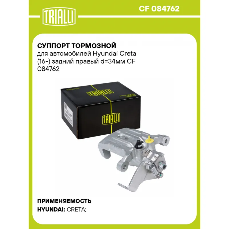 Суппорт тормозной для автомобилей Hyundai Creta (16-) задний правый d=34мм Характеристики: Артикул: CF 084762 OEM номера: 58311-M0A10 Сопутствующий товар: Ремкомплект суппорта: RCF 084761 Сопутствующий товар: Поршень суппорта: RCF 084762 Сопутствующий товар: Скоба суппорта: CF 084792 Сопутствующий товар: Суппорт тормозной: CF 084761 Парный товар: CF 084761 Количество на автомобиль: 1 Диаметр, мм: 34 Количество поршней: 1 Гарантийный срок: 2 года / 60 000 км Толщина тормозного диска, мм: 10 Сторона установки: Задняя ось справа Товарная линейка: BLACK Комплектация: Скоба дискового тормозного механизма (суппорт тормозной без направляющей колодок) - 1 шт Гарантия: от 1 года.