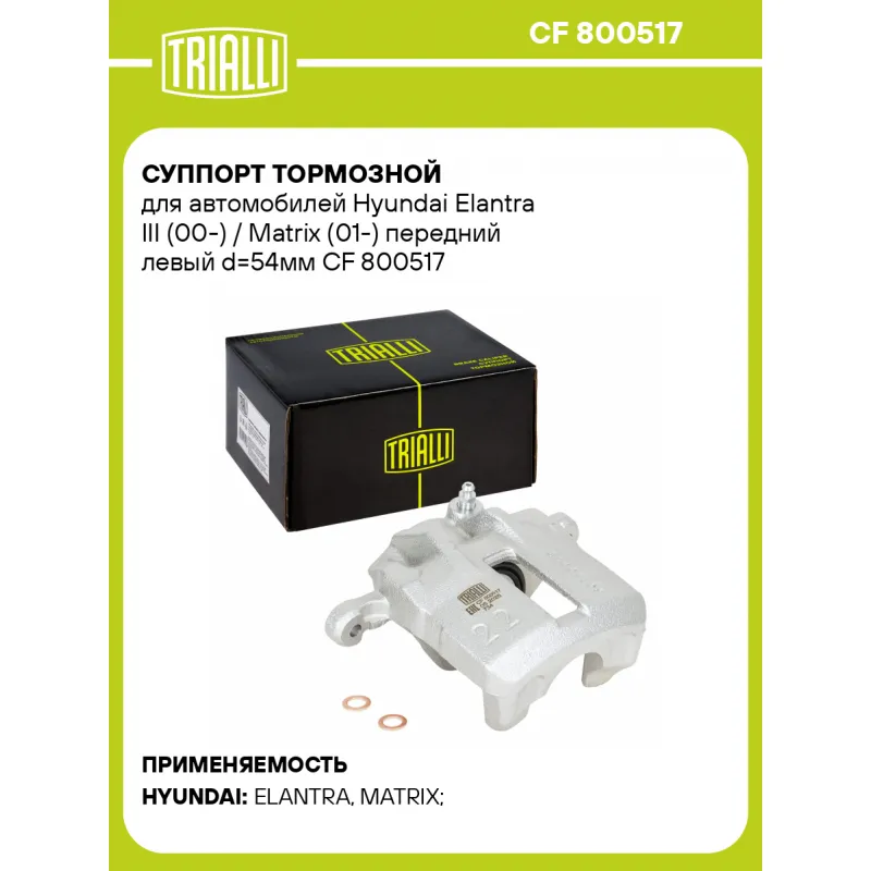 Суппорт тормозной для автомобилей Hyundai Elantra III (00-) / Matrix (01-) передний левый d=54мм Характеристики: Артикул: CF 800517 OEM номера: 58110 17400, 58110 2D700, 58180 2DA10, 58180 2DA20 Тормозная система: MANDO Диаметр, мм: 54 Гарантийный срок: 2 года / 60 000 км Количество поршней: 1 Толщина тормозного диска, мм: 22 Сторона установки: Передняя ось слева Сопутствующий товар: Ремкомплект суппорта: RCF 800517 Сопутствующий товар: Поршень суппорта: RCF 800518 Сопутствующий товар: Скоба суппорта: CF 800519 Сопутствующий товар: Суппорт тормозной: CF 800518 Парный товар: CF 800518 Количество на автомобиль: 1 Товарная линейка: BLACK Комплектация: Скоба дискового тормозного механизма (суппорт тормозной без направляющей колодок) - 1 шт Гарантия: от 1 года.