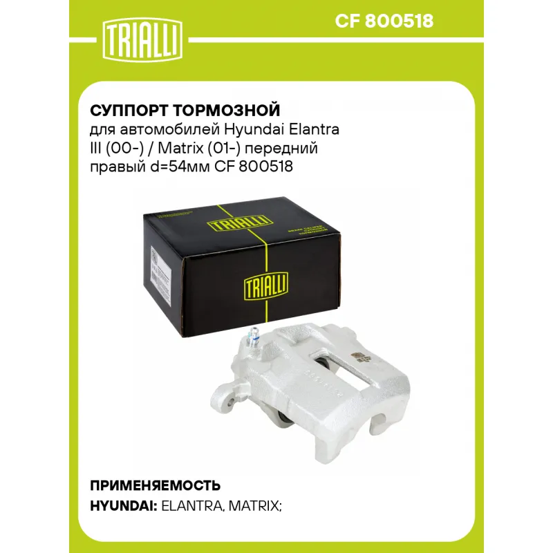 Суппорт тормозной для автомобилей Hyundai Elantra III (00-) / Matrix (01-) передний правый d=54мм Характеристики: Артикул: CF 800518 OEM номера: 58130 17400, 58130 2D700, 58190 2DA10, 58190 2DA20 Тормозная система: MANDO Диаметр, мм: 54 Гарантийный срок: 2 года / 60 000 км Количество поршней: 1 Толщина тормозного диска, мм: 22 Сторона установки: Передняя ось справа Сопутствующий товар: Ремкомплект суппорта: RCF 800517 Сопутствующий товар: Поршень суппорта: RCF 800518 Сопутствующий товар: Скоба суппорта: CF 800519 Сопутствующий товар: Суппорт тормозной: CF 800517 Парный товар: CF 800517 Количество на автомобиль: 1 Товарная линейка: BLACK Комплектация: Скоба дискового тормозного механизма (суппорт тормозной без направляющей колодок) - 1 шт Гарантия: от 1 года.