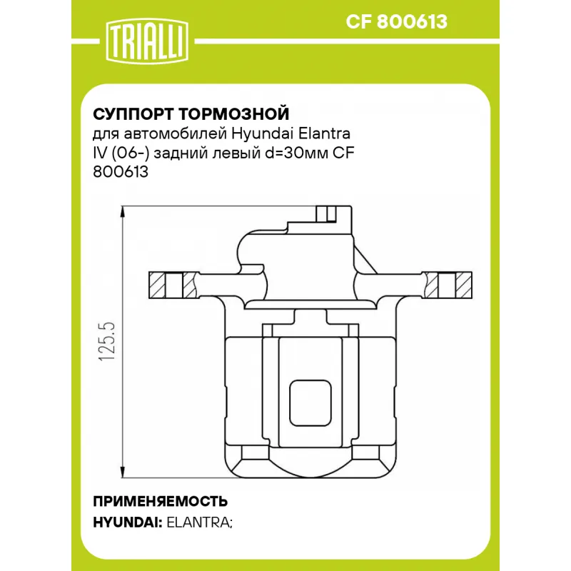 Суппорт тормозной для автомобилей Hyundai Elantra IV (06-) задний левый d=30мм Характеристики: Артикул: CF 800613 OEM номера: 58210 2H300, 58210 2H500, 58310 2HA00 Тормозная система: MANDO Диаметр, мм: 30 Гарантийный срок: 2 года / 60 000 км Количество поршней: 1 Толщина тормозного диска, мм: 10 Сторона установки: Задняя ось слева Сопутствующий товар: Ремкомплект суппорта: RCF 800613 Сопутствующий товар: Поршень суппорта: RCF 800614 Сопутствующий товар: Скоба суппорта: CF 800615 Сопутствующий товар: Суппорт тормозной: CF 800614 Диаметр тормозного диска, мм: 258 Парный товар: CF 800614 Количество на автомобиль: 1 Товарная линейка: BLACK Комплектация: Скоба дискового тормозного механизма (суппорт тормозной без направляющей колодок) - 1 шт Гарантия: от 1 года.