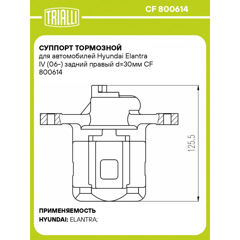 Суппорт тормозной для автомобилей Hyundai Elantra IV (06-) задний правый d=30мм Характеристики: Артикул: CF 800614 OEM номера: 58230 2H300, 58230 2H500, 58311 2HA00 Тормозная система: MANDO Диаметр, мм: 30 Гарантийный срок: 2 года / 60 000 км Количество поршней: 1 Толщина тормозного диска, мм: 10 Сторона установки: Задняя ось справа Сопутствующий товар: Ремкомплект суппорта: RCF 800613 Сопутствующий товар: Поршень суппорта: RCF 800614 Сопутствующий товар: Скоба суппорта: CF 800615 Сопутствующий товар: Суппорт тормозной: CF 800613 Диаметр тормозного диска, мм: 258 Парный товар: CF 800613 Количество на автомобиль: 1 Товарная линейка: BLACK Комплектация: Скоба дискового тормозного механизма (суппорт тормозной без направляющей колодок) - 1 шт Гарантия: от 1 года.