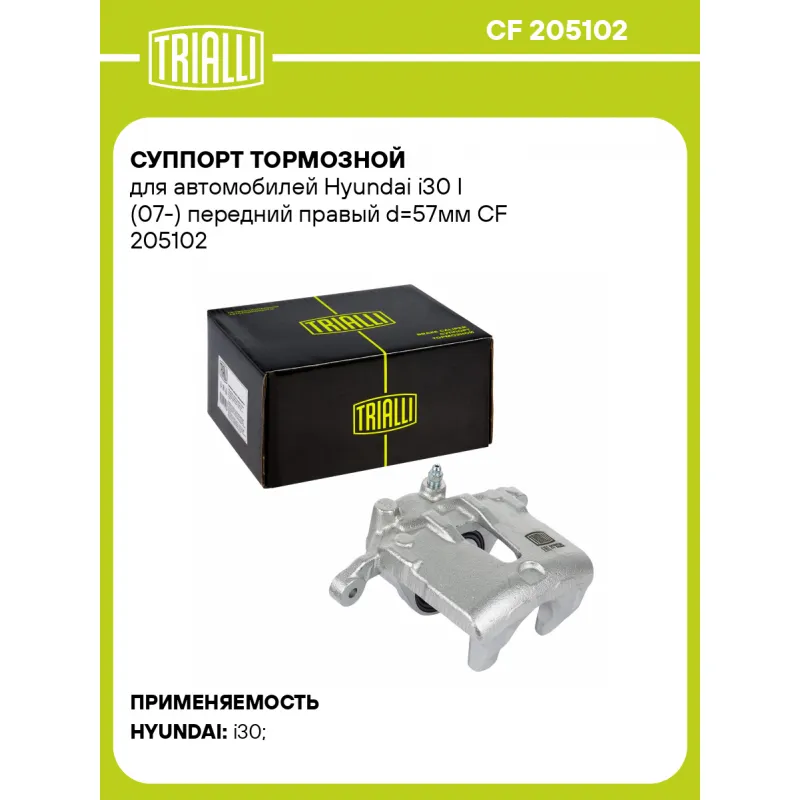 Суппорт тормозной для автомобилей Hyundai i30 I (07-) передний правый d=57мм Характеристики: Артикул: CF 205102 OEM номера: 58130 2L500 Тормозная система: MOBIS Диаметр, мм: 57 Гарантийный срок: 2 года / 60 000 км Количество поршней: 1 Толщина тормозного диска, мм: 28 Сторона установки: Передняя ось справа Сопутствующий товар: Ремкомплект суппорта: RCF 205101 Сопутствующий товар: Поршень суппорта: RCF 205102 Сопутствующий товар: Скоба суппорта: CF 205103 Сопутствующий товар: Суппорт тормозной: CF 205101 Парный товар: CF 205101 Количество на автомобиль: 1 Товарная линейка: BLACK Комплектация: Скоба дискового тормозного механизма (суппорт тормозной без направляющей колодок) - 1 шт Гарантия: от 1 года.